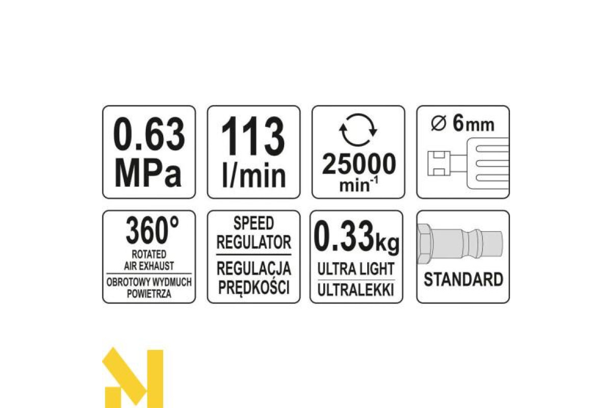 Шліфмашина пряма пневматична Yato має такі особливості: