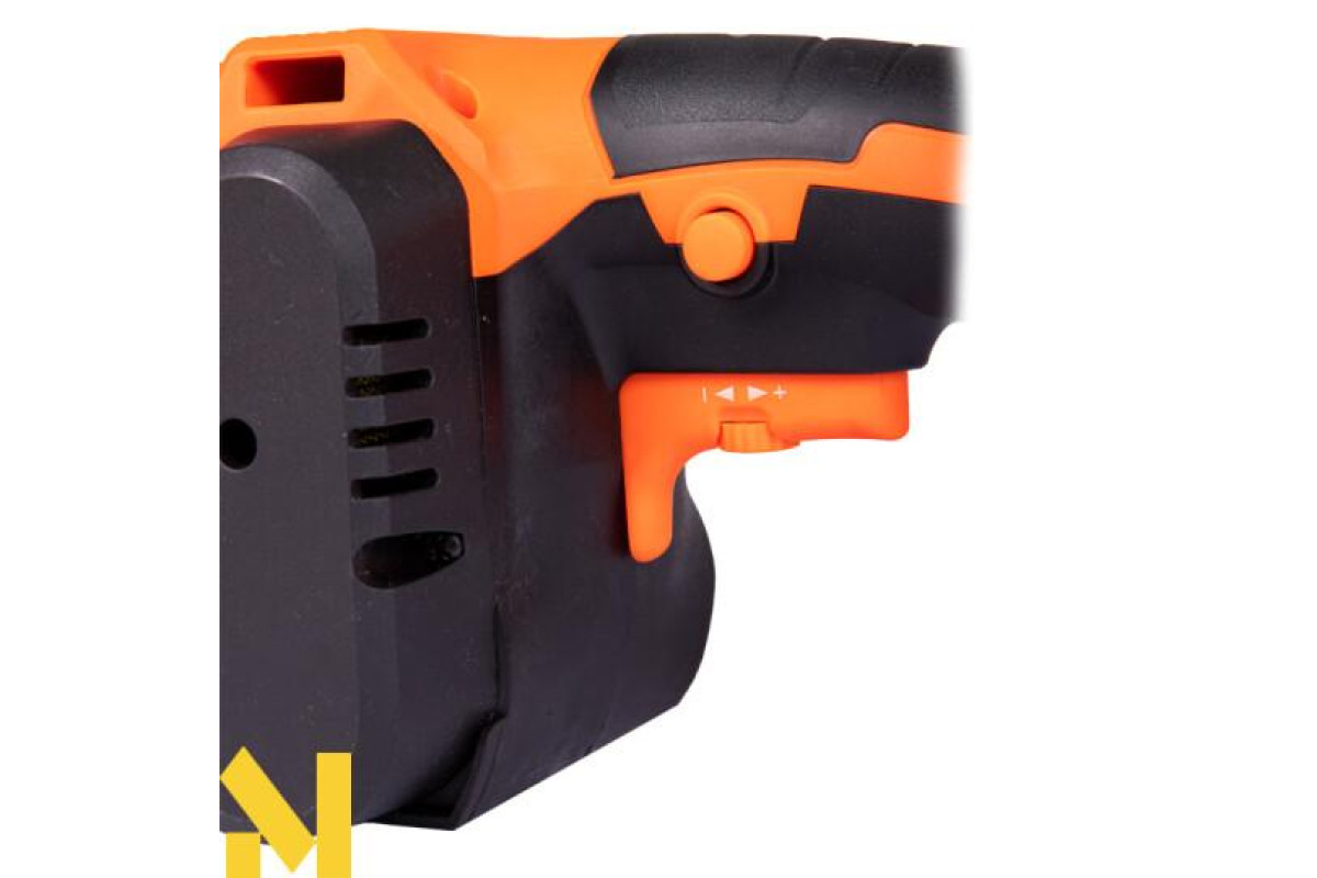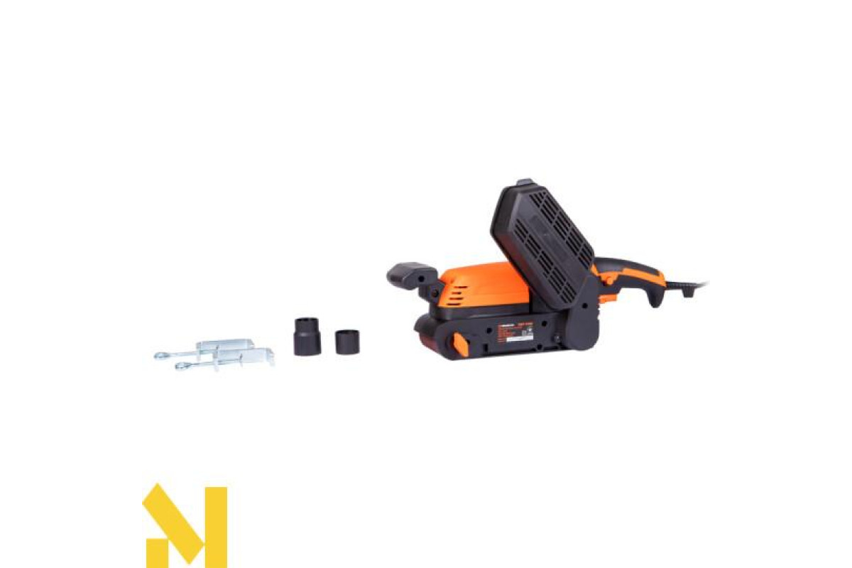 Корпус електроінструменту оснащений регулятором зміни швидкості руху стрічки. Шліфування здійснюється за допомогою рухомої абразивної кільцевої стрічки на тканинній основі. Зручна система натягу дозволяє швидко замінити стрічкове полотно в разі необхідності.