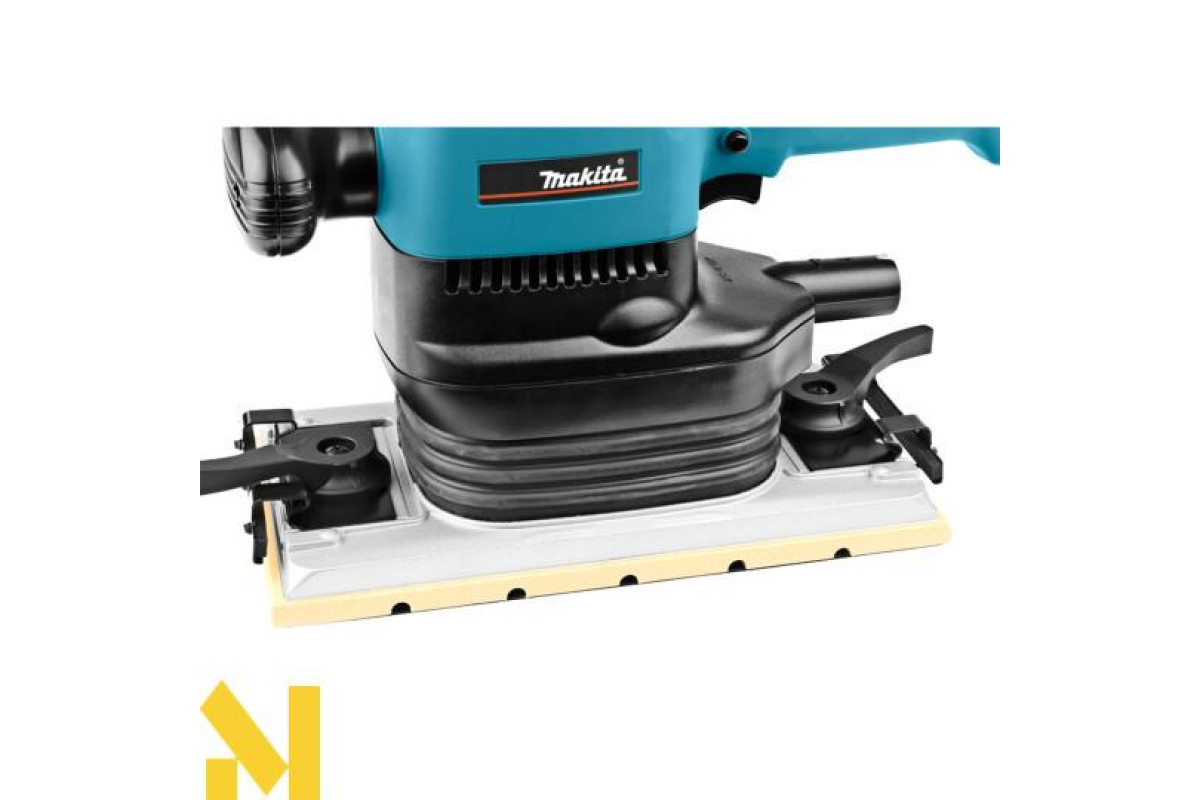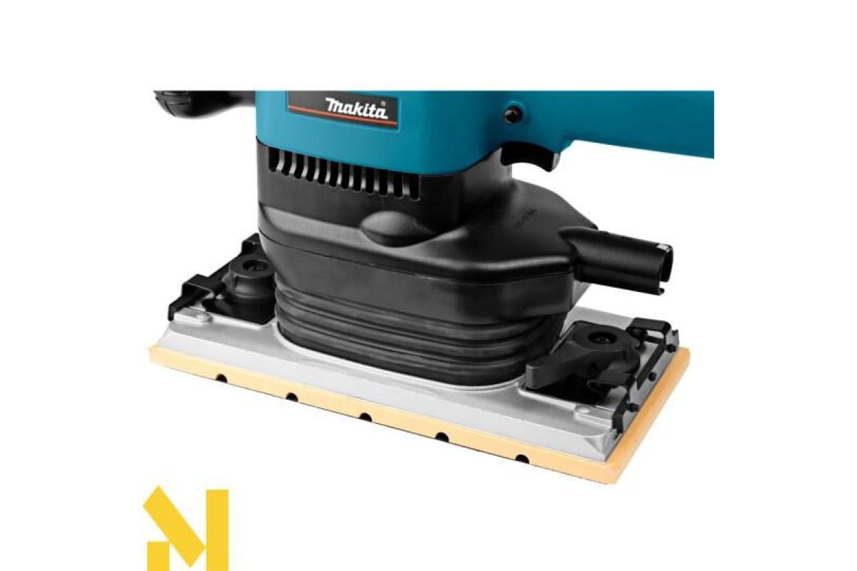 У шліфувальної машини Makita 9046 пил видаляється через опорну плиту. Ця модель укомплектована паперовим пилозбирачем з утримувачем і шліфпапером. Агрегат може підключатися до пилососа. Сучасна система демпфірування практично зводить до нуля вібрацію під час роботи.