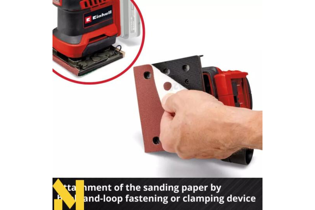 Наждачний папір можна швидко замінити за допомогою застібки-липучки та закріпити без складок. Також вбудований затискний пристрій для кріплення стандартного наждачного паперу.