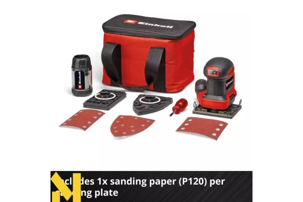 Поставляється з уже встановленою шліфувальною пластиною (101 x 113 мм). Він має систему знімних пластин, а також поставляється з подовженою пластиною (80 x 130 мм) і дельта-шліфувальною пластиною (150 x 150 x 100 мм), а також викруткою для заміни пластини. Всього в комплект поставки також входить наждачний папір (P120), тобто один наждачний папір на пластину.