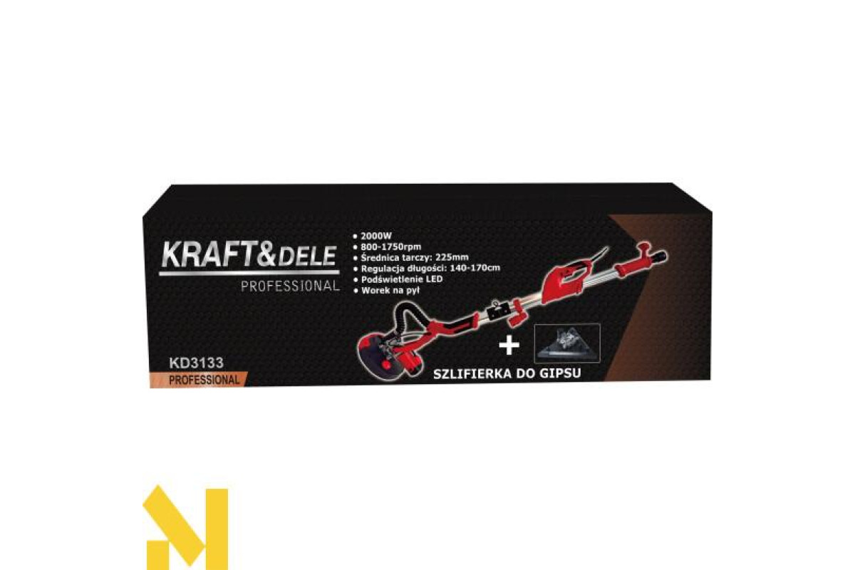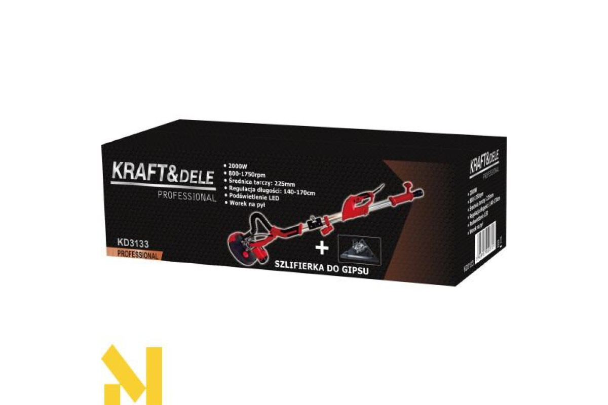 KD3133 — це потужна шліфувальна машина для гіпсу від бренду KRAFT&DELE, розроблена для шліфування стін і стель, у тому числі у важкодоступних місцях та на великій висоті. Завдяки телескопічній конструкції та великому діаметру диска пристрій забезпечує швидке та зручне вирівнювання поверхні.