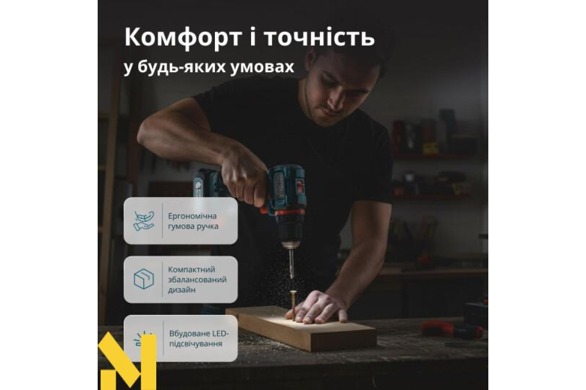 Потужність для твердих матеріалів: дриль забезпечує стабільну силу закручування до 60 Н·м — цього достатньо для роботи навіть із міцними поверхнями — металом чи товстими дерев’яними балками.