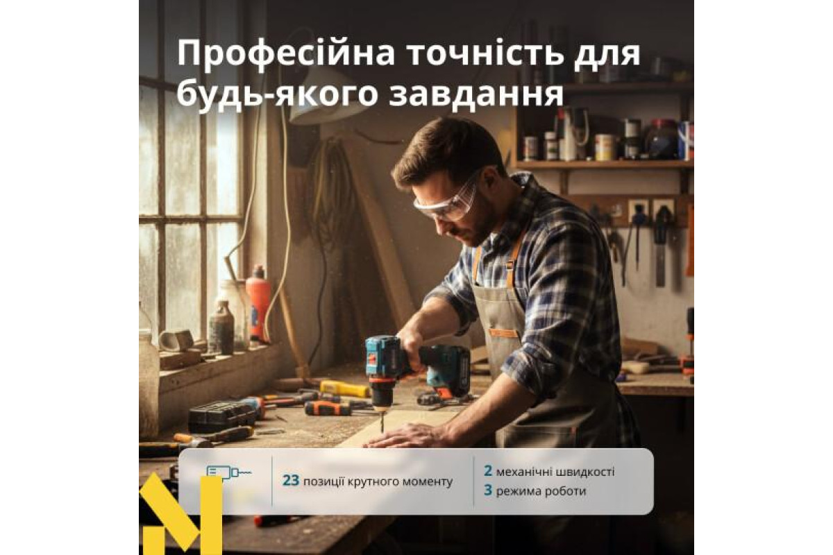 Універсальні режими та точне налаштування - інструмент має 23 позиції крутного моменту, що забезпечують точне регулювання сили закручування під різні матеріали та типи кріплень, та 3 режими роботи — свердління, закручування та свердління з ударом з ударною частотою до 28500 уд/хв.