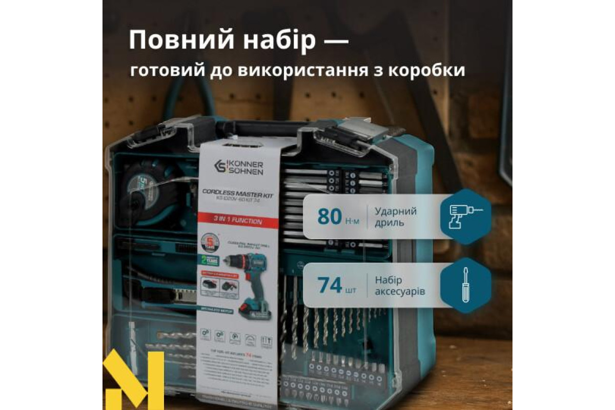 KS ID20V-60 KIT 74 - набір інструментів у кейсі, що поєднує акумуляторний ударний дриль, комплект із 74 аксесуарів — біти, свердла та насадки, акумулятор 2 А·год та зарядний пристрій 2.4 А. Дриль має три режими роботи: свердління, закручування та ударне свердління (28500 уд/хв), що дозволяє свердлити метал чи дерево, а дві передачі та 23 налаштування крутного моменту дають точність для будь-якого завдання. Безщітковий двигун забезпечує до 60 Нм крутного моменту, працює тихо й ефективно. Для комфортного використання є рукоятка з гумовим покриттям, LED-підсвітка та петля для ременя. Система безпеки інструменту включає в себе захист від перегріву, перевантаження й надмірного розрядження.