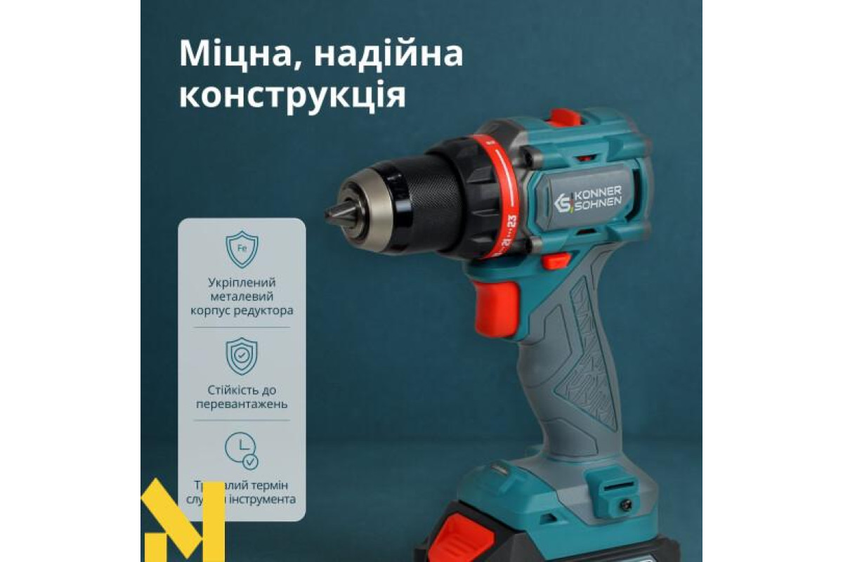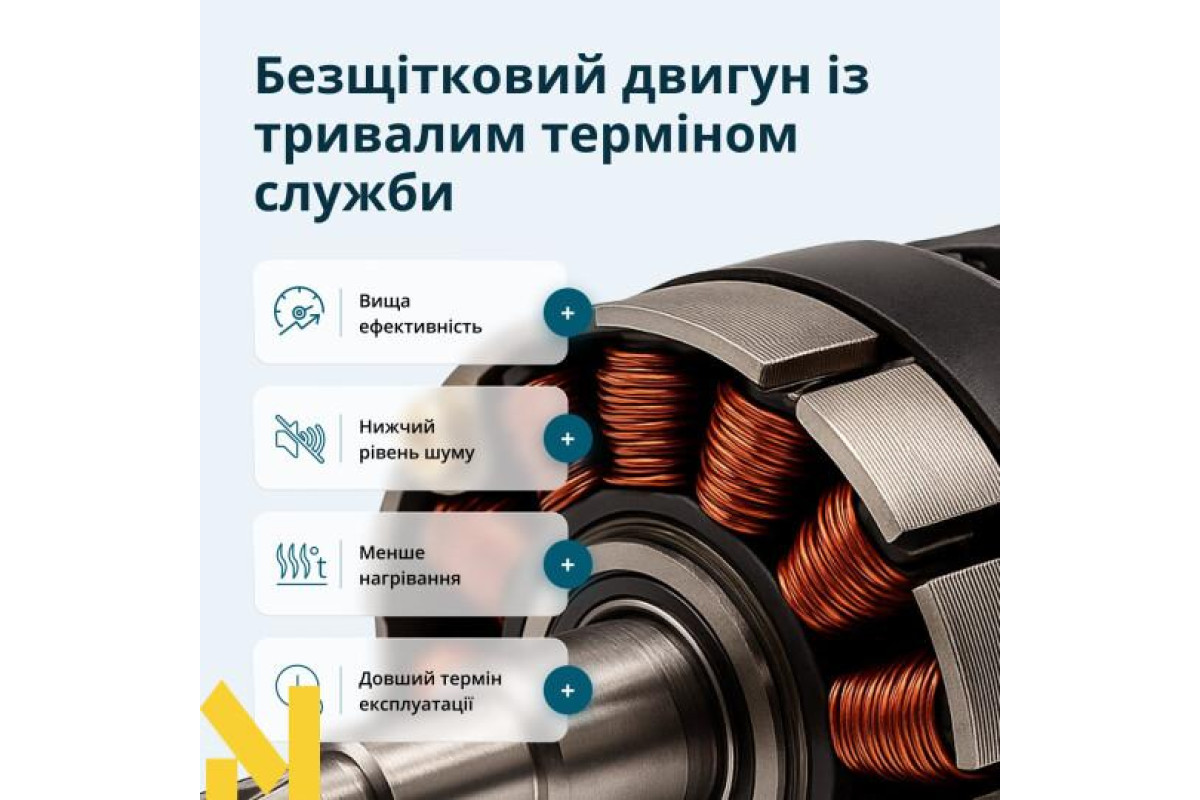 Надійний та довговічній інструмент: дриль має безщітковий двигун, який забезпечує тривалий ресурс, стабільну потужність і менше нагрівання під час роботи, а посилений корпус редуктора з металевими деталями захищає внутрішні механізми від перевантажень.