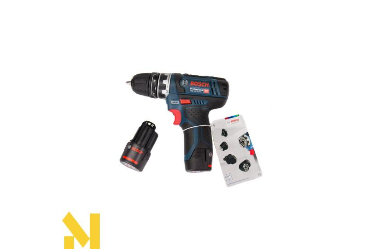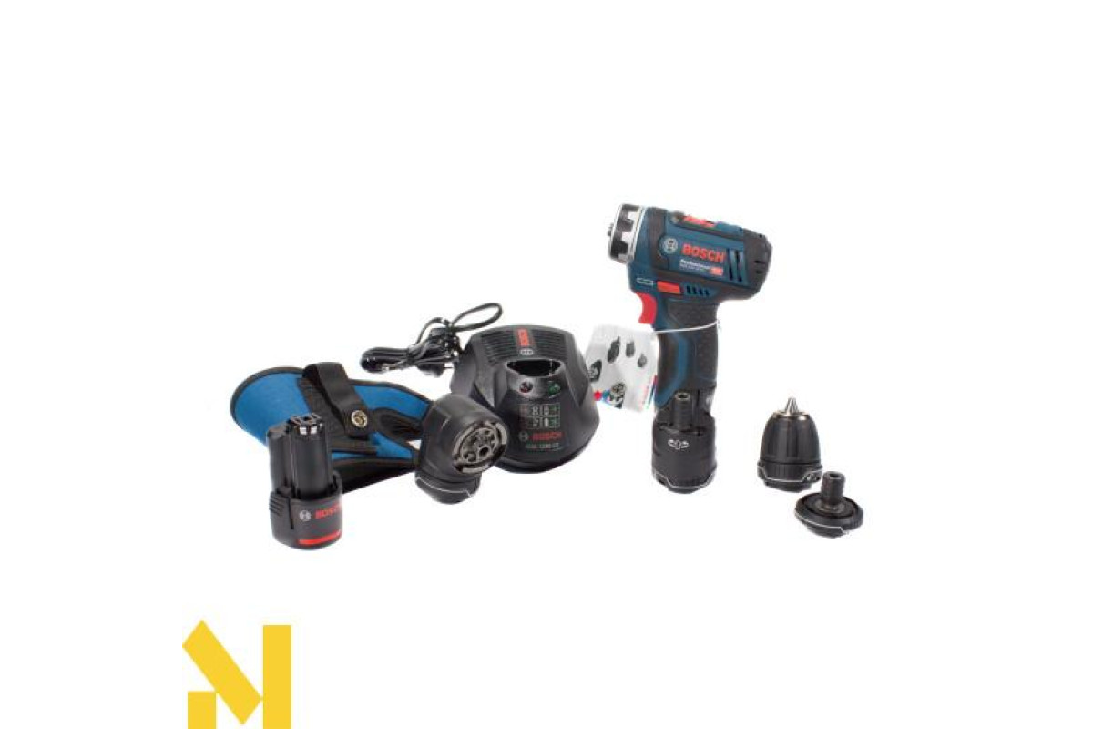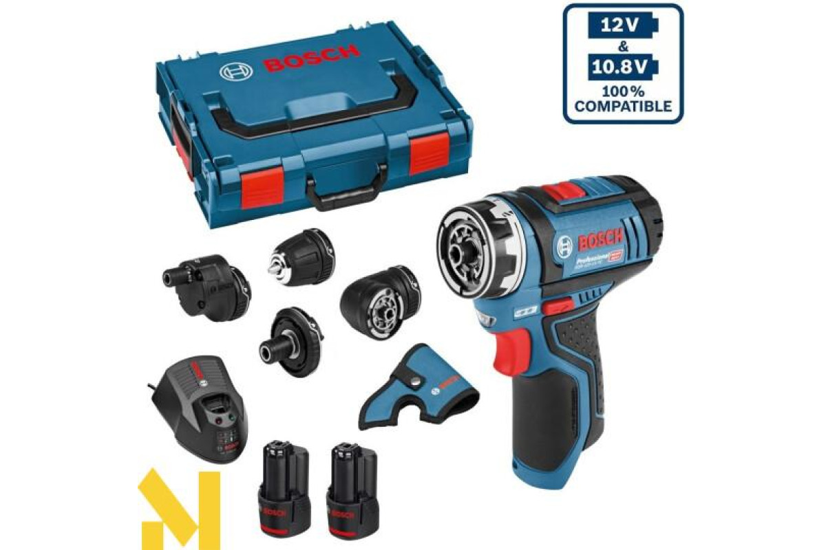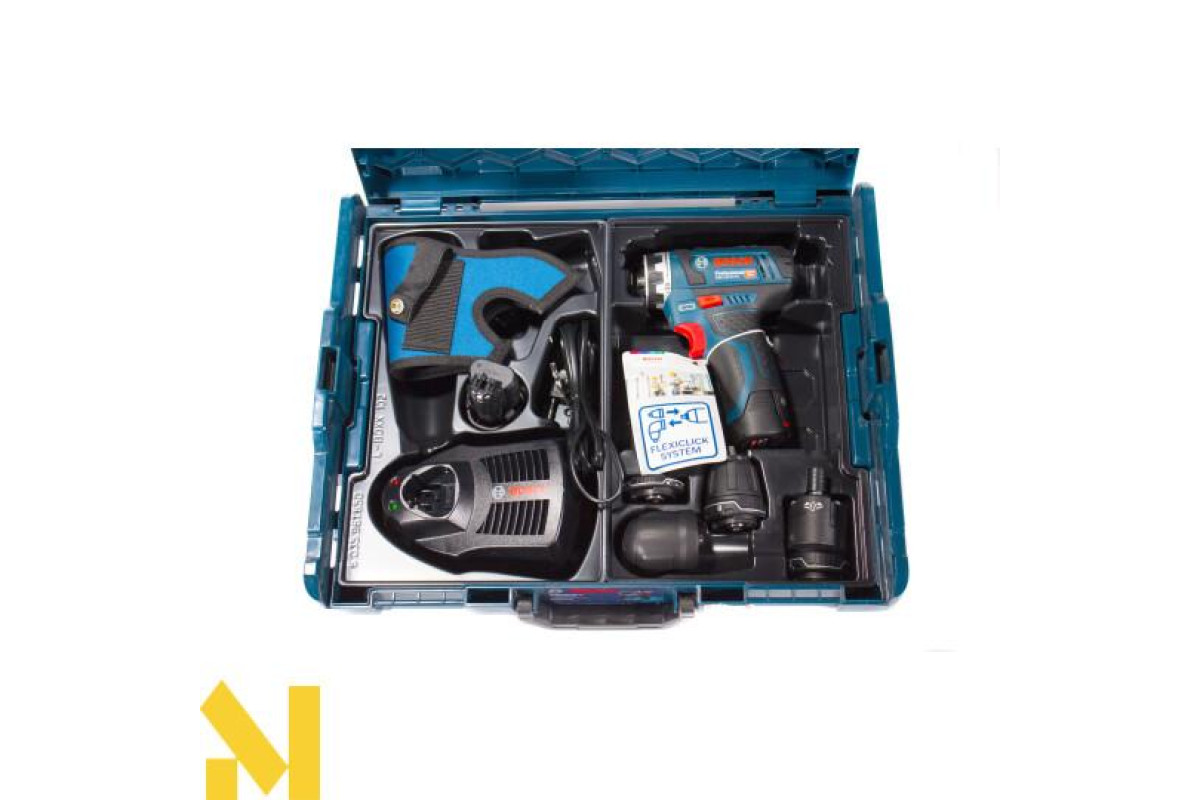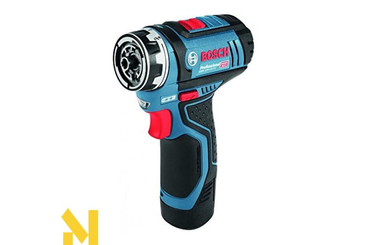 Компактний шуруповерт Bosch GSR 12V-15 FC з додатковими насадками, що дозволяють розширити спектр робіт, - магнітний тримач біт, патрон, кутова і ексцентрикова насадки. Дві робочі швидкості (0-400 і 0-1300 об/хв), реверс, регульований крутний момент (15 Нм м'які/30 Нм жорсткі матеріали). Працює з кріпленням діаметром до 7 мм. Застосування сверлильного патрона для свердел з хвостовиками 1-10 мм дає можливість робити отвори в деревині 19 мм, металі 10 мм. Приводиться в дію літій-іонним 12 В акумулятором 2,0 Ач. Поставляється в L-Boxx 102 з перерахованими насадками, двома елементами живлення, зарядним пристроєм.