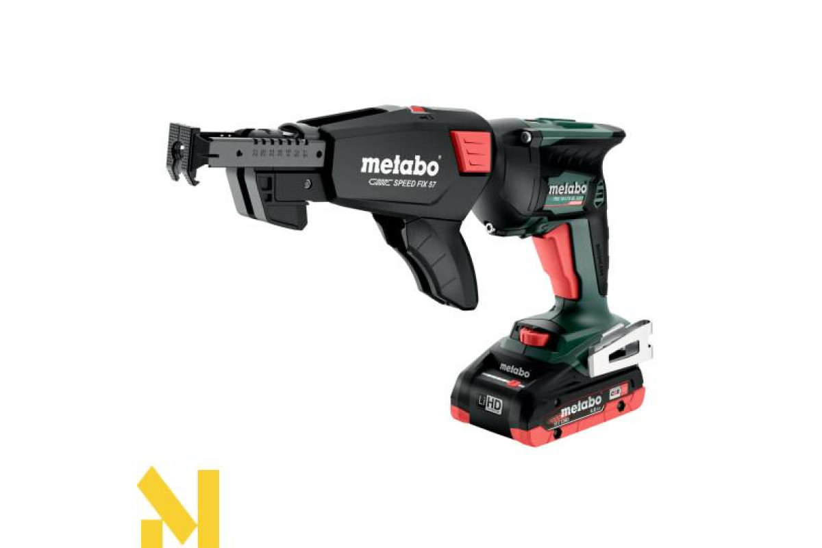 Акумуляторний шуруповерт Metabo TBS 18 LTX BL 5000 + Speed Fix 57 - це готовий комплект, який складається з безщіткового шуруповерта, магазину Speed Fix 57, акумуляторних блоків і зарядного пристрою.