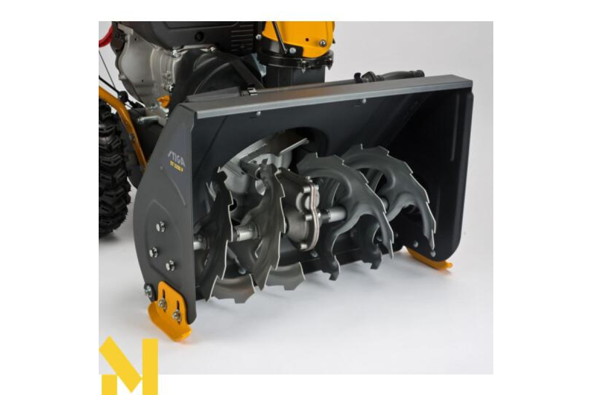 Запустити снігоприбиральник Stiga ST 3255 Р вручну, не дивлячись на сильні морози, не становить великих труднощів. Розрубати залежаний сніг і направити його для викиду на крильчатку допомагає сталевий зубчастий шнек, шириною 55 см. При цьому висота хвата дорівнює 40 см. Відповідно, прибрати досить велику площу можна, витративши на це мінімум часу. Колеса, обладнані протекторами SnowHog, гарантують хороший контакт з поверхнею.