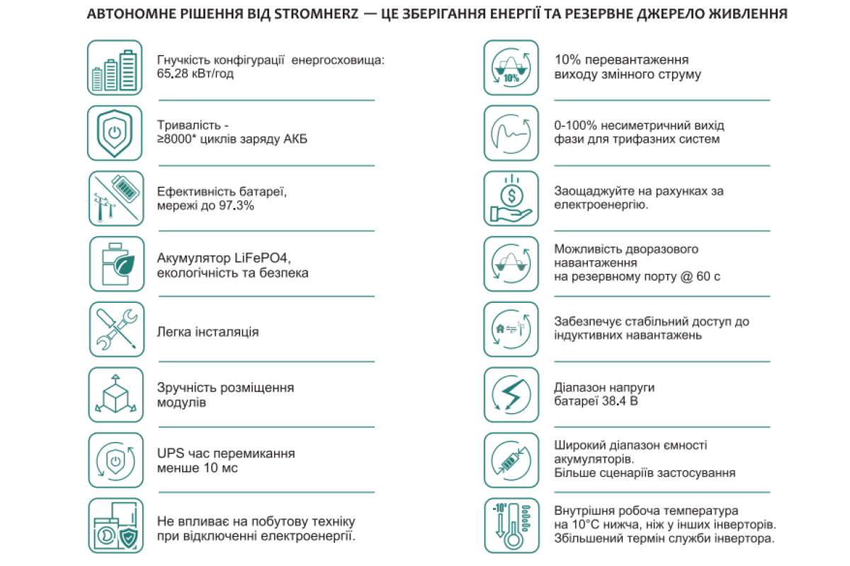 Комерційна система акумулювання енергії S-50K-3Р-40А-ESS-UA (GEN3) 65,28 кВт від провідного австрійського виробника Stromherz це інтелектуальні гібридні системи збереження енергії великих об’ємів, які перетворюють енергію сонця в акумулятори на цілодобовий ресурс, одночасно пропонуючи резервне живлення у разі збою в електромережі. Stromherz зберігає, знижує витрати на енергію, покращує стійкість мережі.