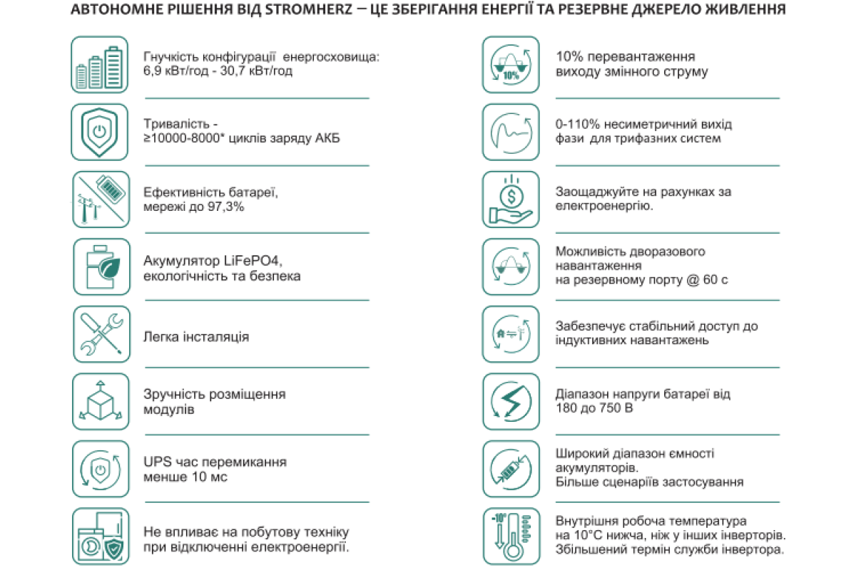 Гібридні інвертори від провідного австрійського виробника Stromherz це інтелектуальні гібридні системи збереження енергії, які перетворюють енергію сонця в акумулятори на цілодобовий ресурс, одночасно пропонуючи резервне живлення у разі збою в електромережі. Stromherz зберігає, знижує витрати на енергію , покращує стійкість мережі. Акумулятори та інвертори є найкращою пропозицією на ринку за співвідношенням ціна-якість.