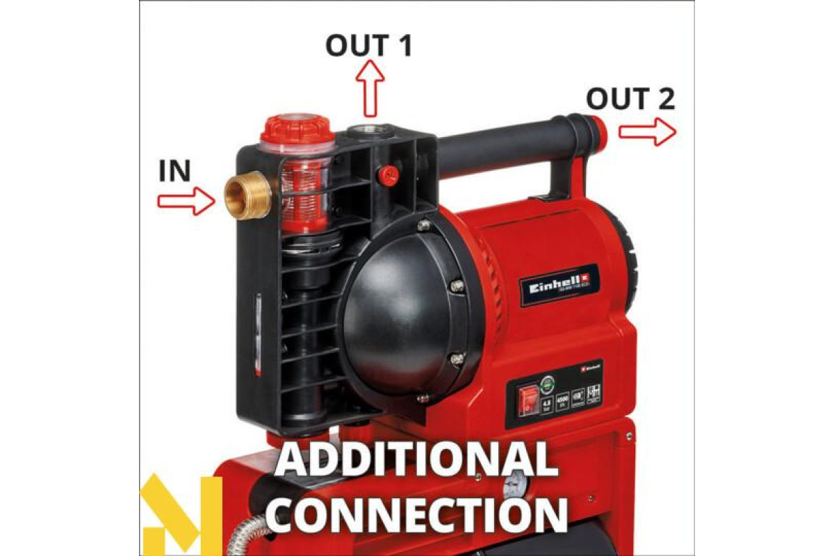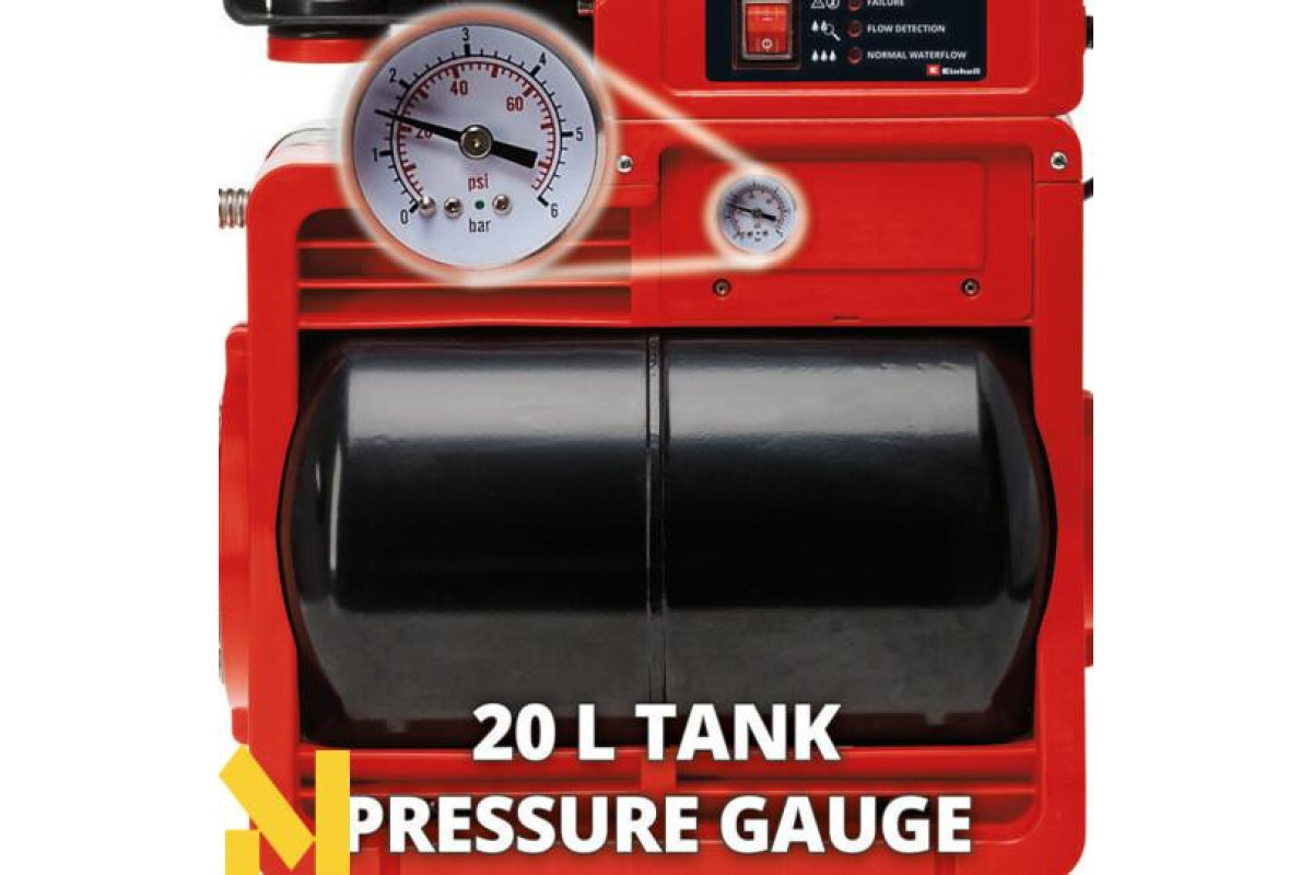 Насосна станція Einhell GE-WW 1145 ECO має перемикач Увімкнути/Вимкнути, індикатор рівня води, бруду і всмоктування. Великий наповнювач дає змогу легко залити воду під час старту насоса. Для повного спорожнення насоса є водовідливний гвинт для зливу води. Повний захист забезпечується термостатичним вимикачем, а також фільтром грубого очищення зі зворотним клапаном. Гідровузол оснащений високоякісними механічними ущільненнями, роз'ємом вторинного тиску і роз'ємами тривалого приймання і тиску, виготовленими з високоякісного металу, а також великим баком ємністю 20 л. Продукт постачається з адаптером із внутрішнім різьбленням 1" (33,3 мм).