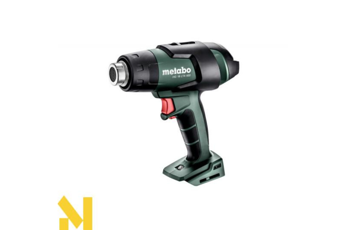 Акумуляторний термофен Metabo HG 18 LTX 500 новинка 2020 року. Дана модель розширює лінійку 18 В інструменту. До цієї комплектацію входить каркас термофена, дві насадки і картонна коробка.