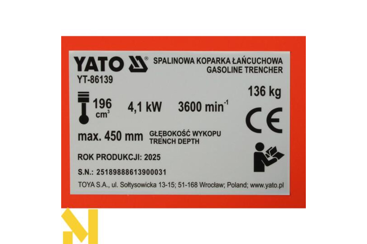 Бензиновий ланцюговий екскаватор YATO YT-86139 призначений для виконання вузьких, рівних виїмок за короткий час і з повторюваною точністю. Конструкція пристрою відповідає потребам монтажних та садівничих бригад, для яких важлива можливість роботи вздовж огорож, тротуарів та існуючої інфраструктури без надмірного порушення рельєфу місцевості. Машина дозволяє виконувати лінійні роботи при обмеженій ширині траншеї, що значно зменшує кількість виїмки та час, необхідний для засипання.