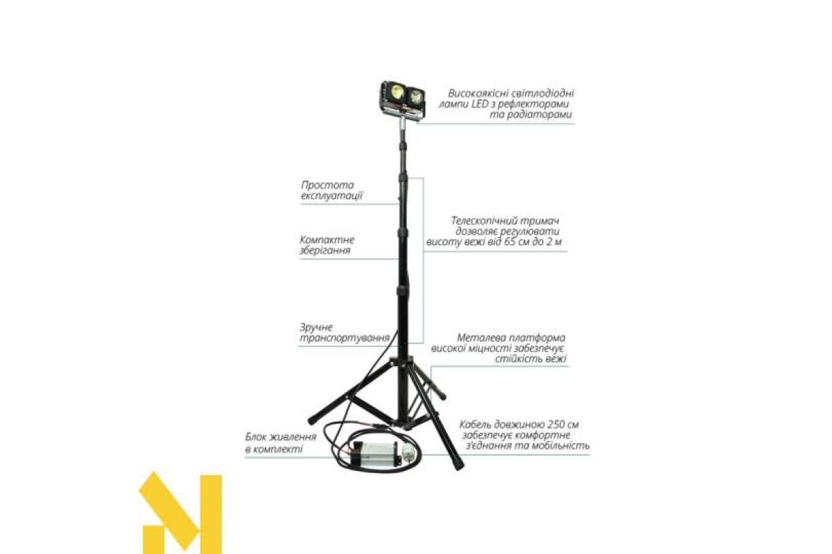 Телескопічний тримач дозволяє регулювати висоту освітлення до 2 м