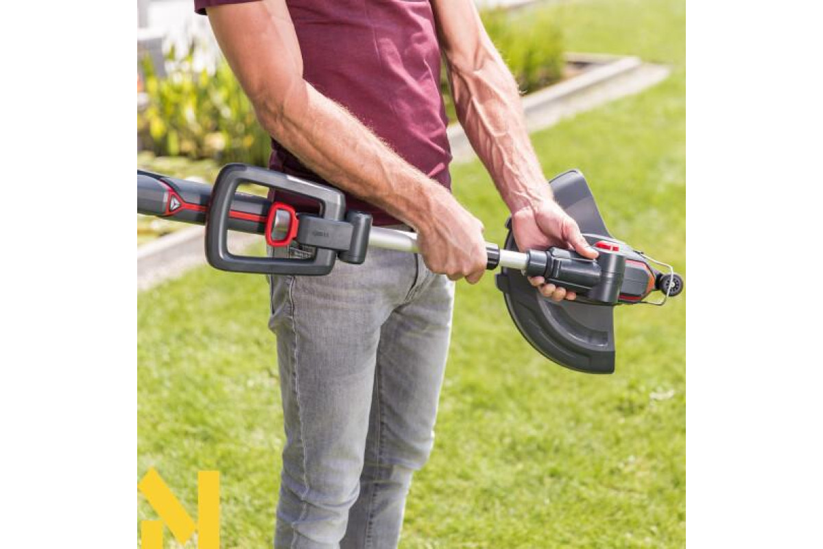 При вазі всього 2,4 кг, включно з акумулятором і ергономічною регульованою додатковою ручкою, цей мобільний і простий у використанні тример стане незамінним помічником для кожного садівника. Гнучка регульована різальна головка з шириною скошування від 25 см і спеціальна скоба забезпечує точний зріз країв газону, акуратне косіння під кущами і вздовж стін. Завдяки напівавтоматичній системі подачі волосіні ви з легкістю регулюєте оптимальну довжину волосіні просто під час косіння, для цього Вам просто необхідно постукати по ріжучій голівці об землю. А регульована по висоті алюмінієва телескопічна штанга налаштовується під Ваш зріст. Складне колесо для обкошування країв допоможе Вам із чистим обрізанням крайок.