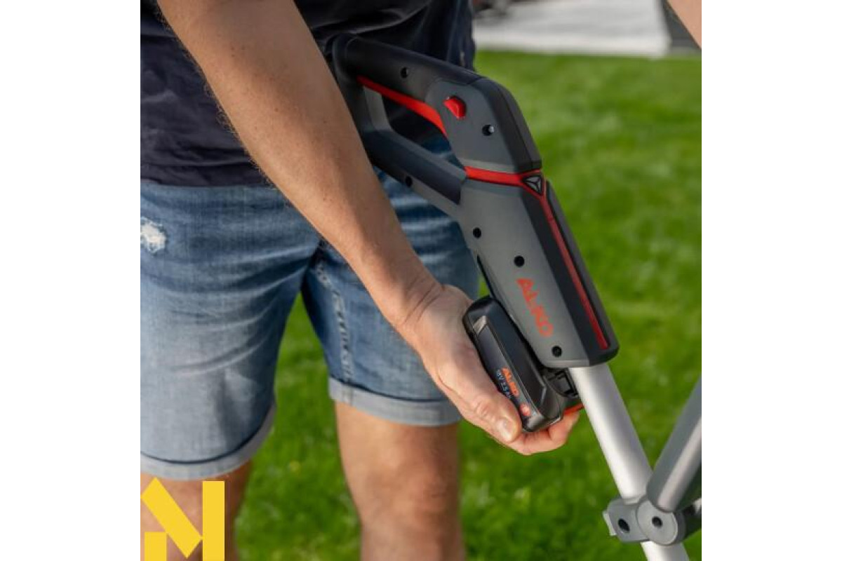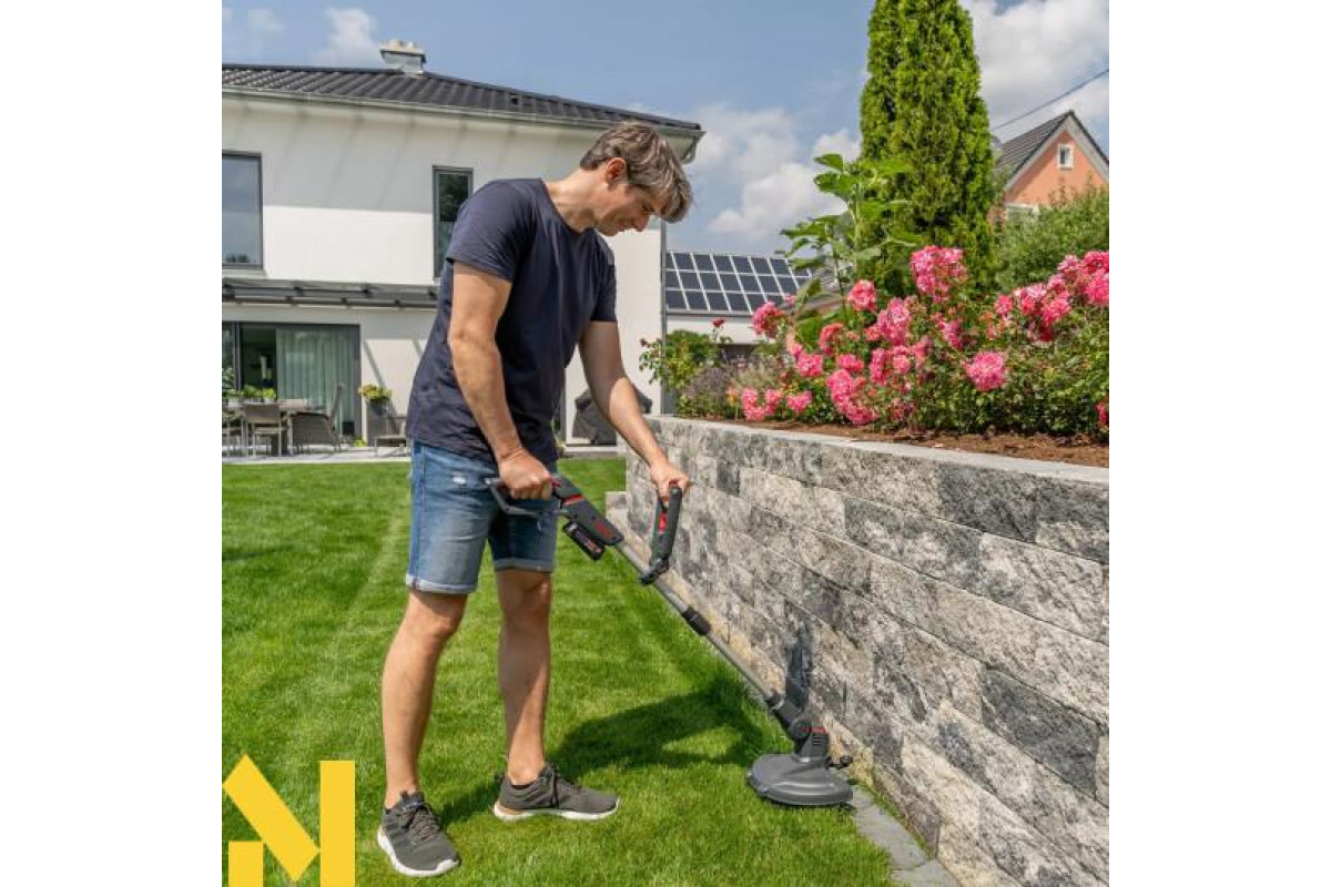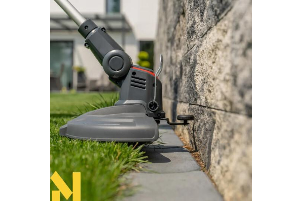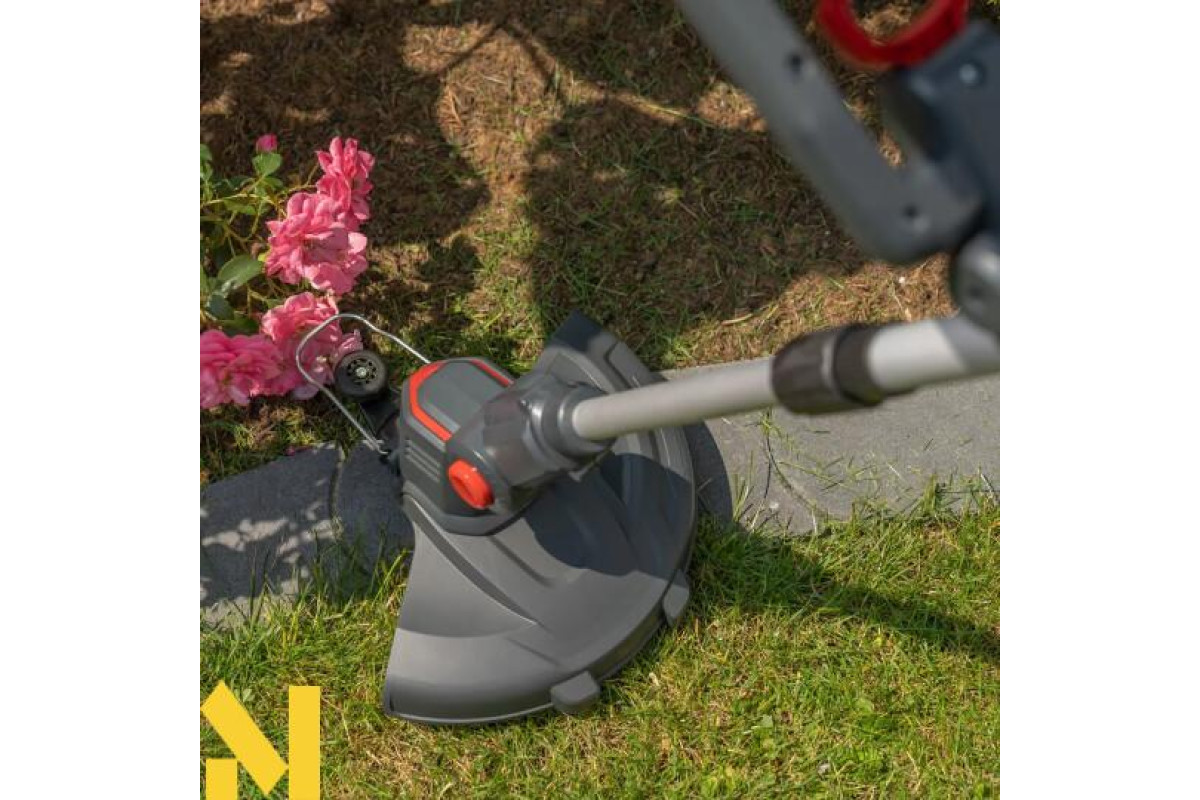 Живлення двигун отримує від сучасного літій-іонного АКБ (у комплект не входить). Батарея має невеликі розміри та вагу, заряджається всього за кілька годин та характеризується відсутністю ефекту саморозряду. Рівень заряду акумулятора зручно контролювати за світлодіодним індикатором, розташованим на ергономічній ручці агрегату. Як ріжучий інструмент вибрано напівавтоматична головка з ліскою. Спеціальна скоба та спеціальний ролик дають можливість безпечно та якісно підрівнювати краї газонів, обробляти рослинність уздовж парканів та бордюрів.
