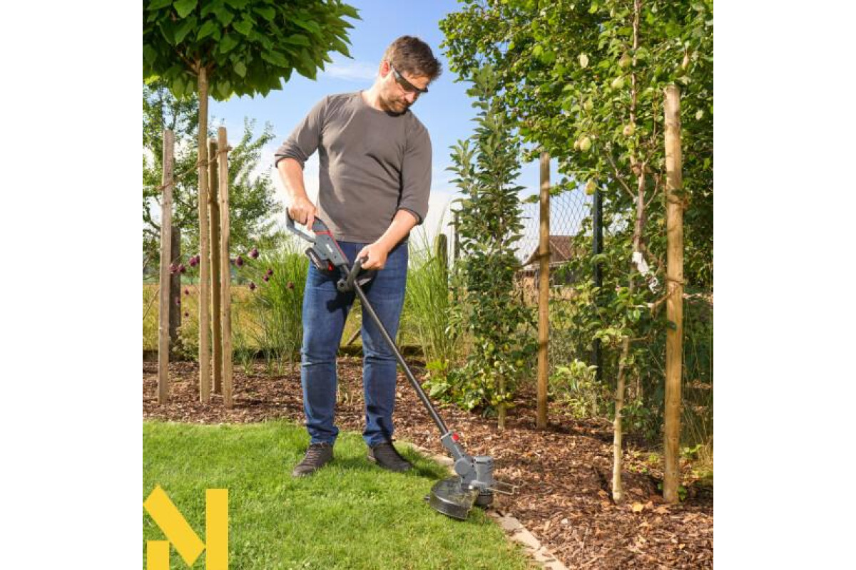З вагою та ергономічною, регульованою додатковою ручкою, тример є мобільним та простим у використанні помічником. Рухома, обертова головка з шириною косіння та дуга для захисту рослин забезпечують точне підстригання по краях газону, під кущами та біля стін. Пристрій має систему автоматичного висунення волосіні. Тример живиться від нашої гнучкої системи 18 В / 36 В (1 акумулятор / 2 напруги). Ви можете використовувати акумулятори ємністю: 2 / 2,5 / 4 / 5 / 8 Аг. Літій-іонні елементи характеризуються високою довговічністю та відсутністю ефекту пам'яті.