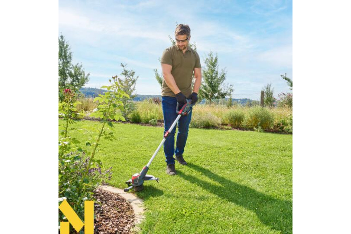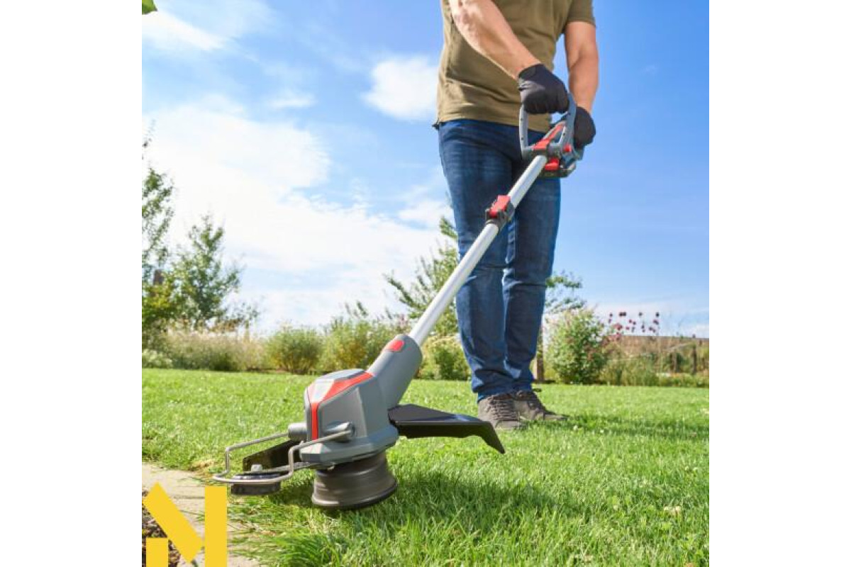 Зручність і функціональність Завдяки вазі та ергономічній, регульованій додатковій ручці, тример є мобільним і простим у використанні помічником для кожного власника саду. Гнучка, поворотна головка з шириною косіння, складане крайове колесо та дужка для захисту рослин забезпечують точне скошування по краях газону, під кущами та біля стін. Висунення волосіні здійснюється за допомогою системи Tipp-Automatik, а ручка має регулювання довжини.