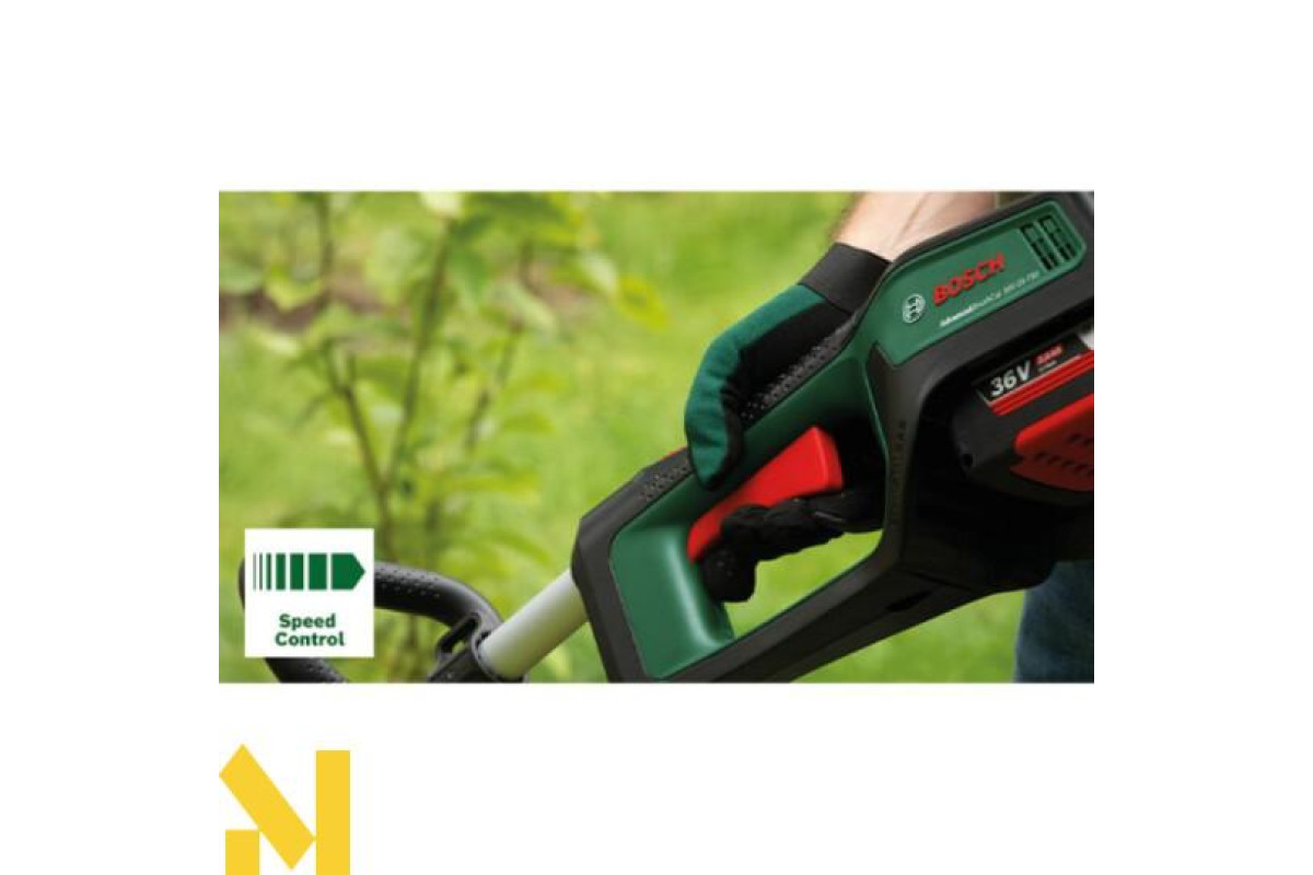 Bosch AdvancedBrushcut 36V-23-750 – ергономічний інструмент високої потужності для скошування довгої трави, бур'янів, кропиви, підліска. Живиться від літій-іонного акумулятора 36 В 2 Ah. Як ріжучий елемент використовується металевий ніж діаметром 23 см, а також котушка з волосінню 3 м завдовжки і товщиною 2.4 мм. Максимальна ширина скошування за один прохід досягає 33 см (при використанні струни). Важить апарат 4,1 кг.