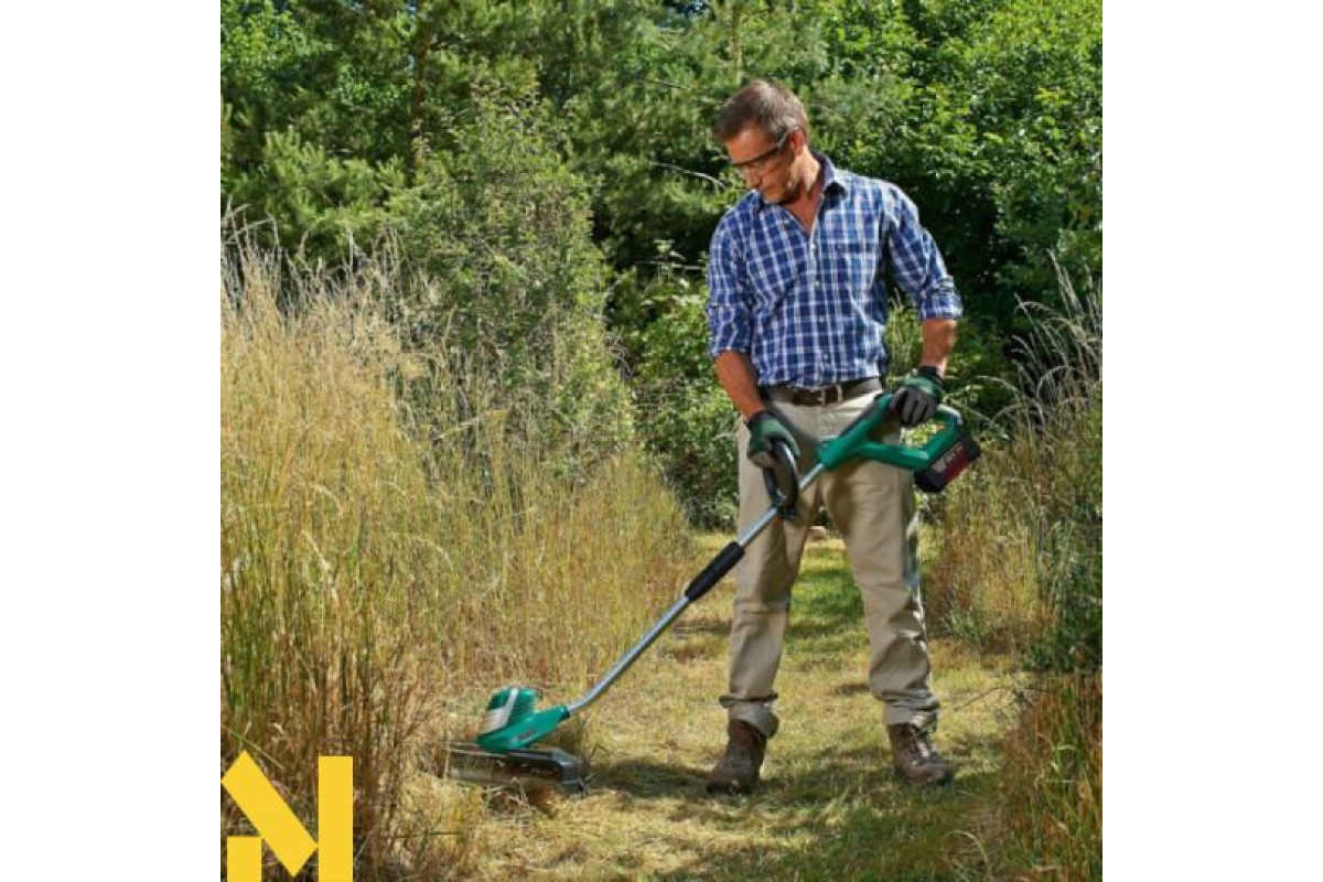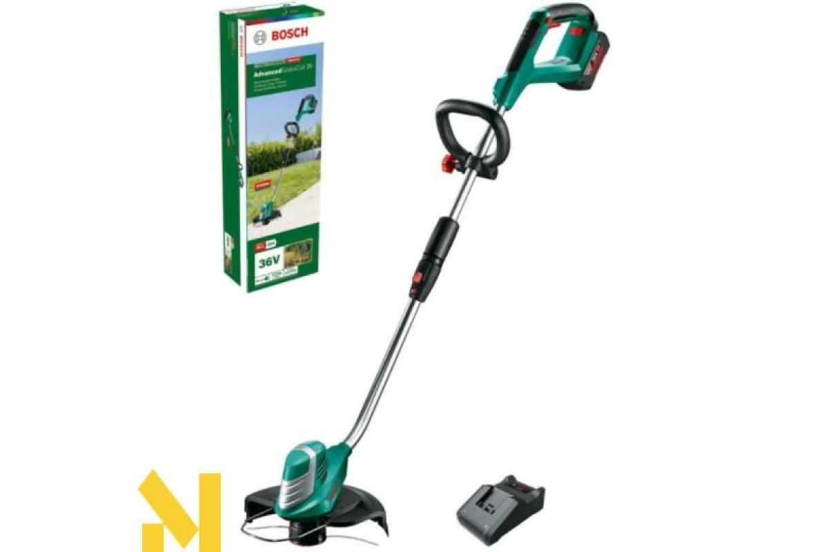 Bosch AdvancedGrassCut 36 – ергономічний інструмент високої потужності для скошування трави на середніх і великих ділянках. Живиться від літій-іонного акумулятора 36 В 2 Ah. Як ріжучий елемент використовується волосінь товщиною 1.6 мм. Ширина скошування за один прохід досягає 30 см. Важить апарат 3,1 кг.