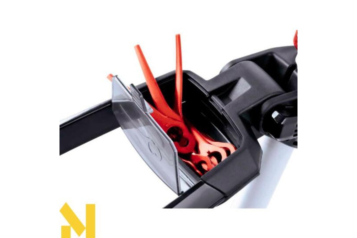 В акумуляторному триммері Einhell GE-CT 18 Li Solo використовується нова революційна система скошування трави: замість громіздких барабанів з волосінню тут застосовується міцний пластиковий ріжучий ніж. Телескопічна довга ручка тримера і додаткова рукоятка з вбудованим відсіком для зберігання додаткових ножів можуть бути плавно відрегульовані під зріст користувача для зручної роботи. Навіть складні умови роботи, такі як різання уздовж вертикальних поверхонь і краю газонів можуть бути легко виконані завдяки регулюванню головки двигуна, який може повертатися на +/- 90 ° і нахилятися під кутом в п'ять різних положень. Обмежувач захисту квітів Flowerguard дозволяє зберегти Ваші квіти і декоративні рослини від пошкодження.