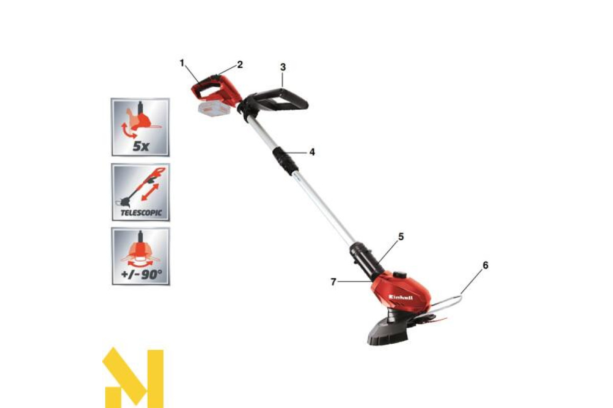 - Головка двигуна може повертатися на +/- 90 °, щоб ви могли розрізати уздовж вертикальних поверхонь і країв газону з легкістю (5)
