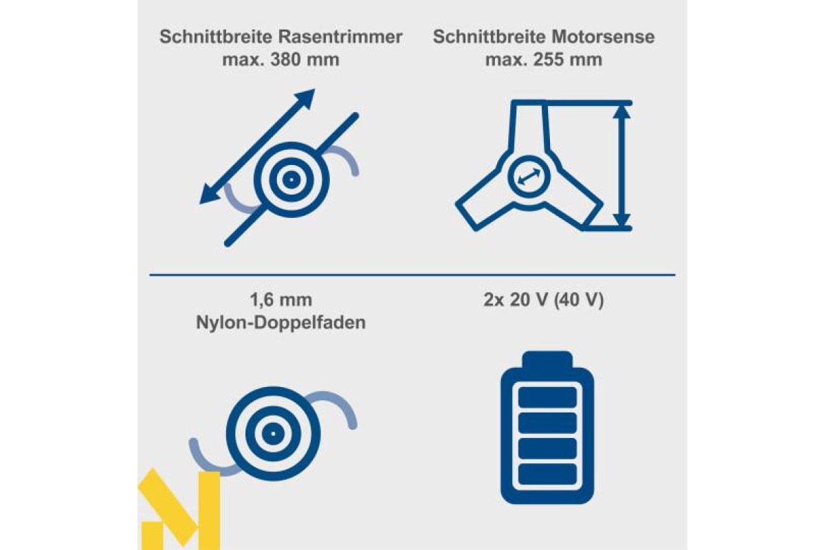 Ширина скошування тримером для трави 380 мм / ширина скошування кущорізом 255 мм
