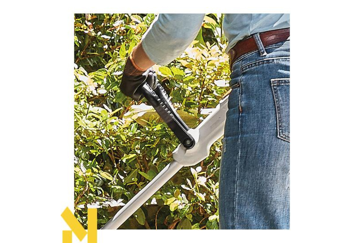 Положення круглої рукоятки зручно регулюється без додаткових інструментів за допомогою гвинта-баранця. Це дозволяє швидко обрати підходяще положення рукоятки, наприклажд під час роботи у вузьких місцях, як-то між кущів та чагарників.