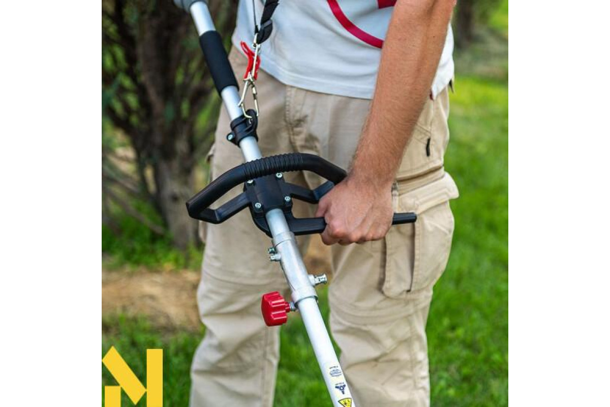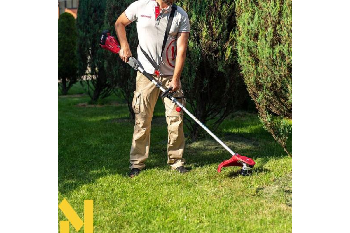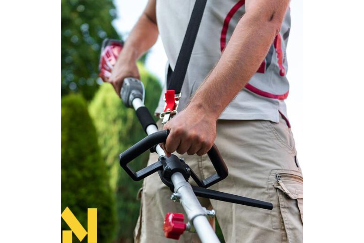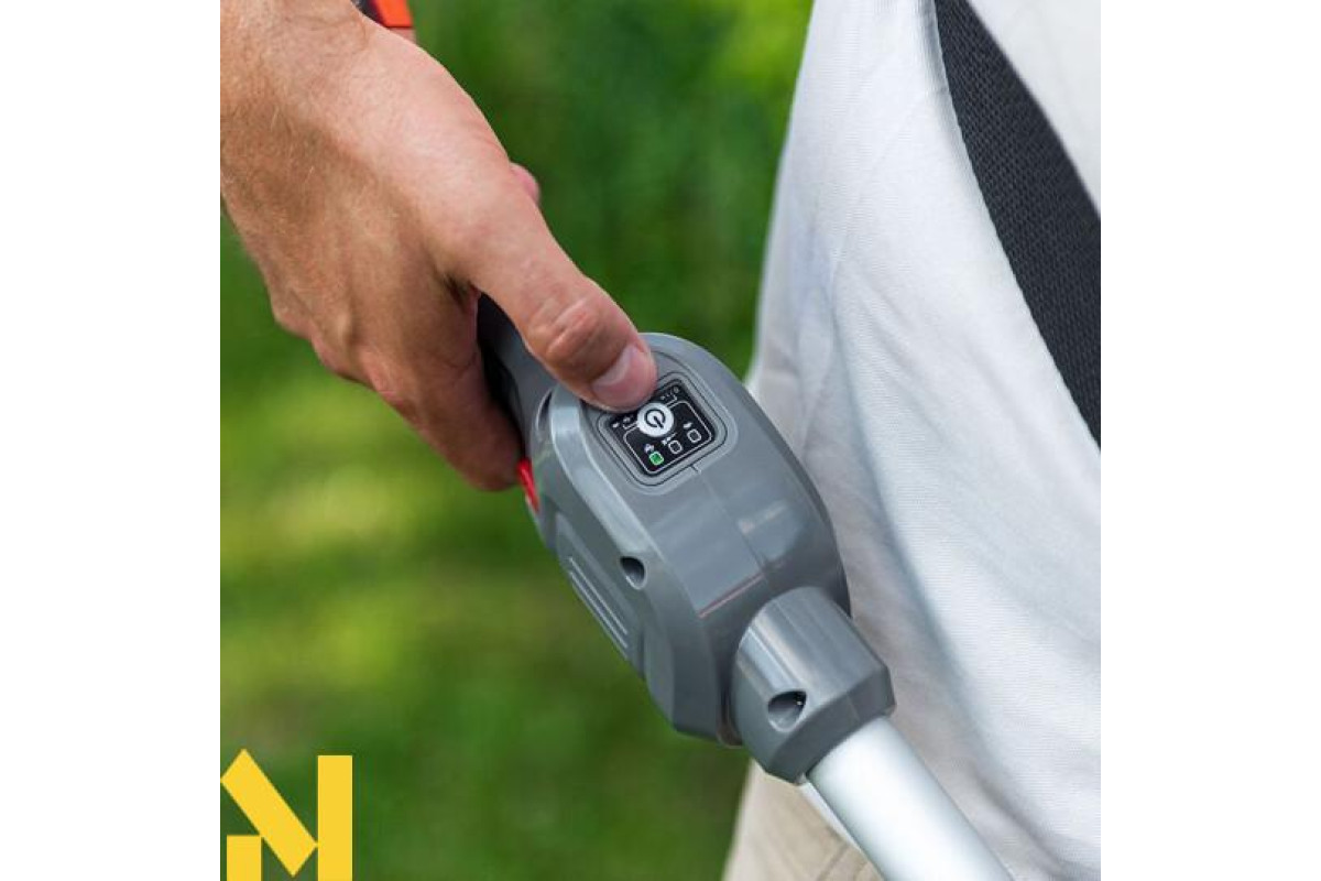 Кнопка блокування пускової клавіші та електронна система активації допомагають уникнути випадкового включення інструменту. Ремінь на плече в комплекті допомагає знизити навантаження на руки та обробити газон швидше і якісніше.