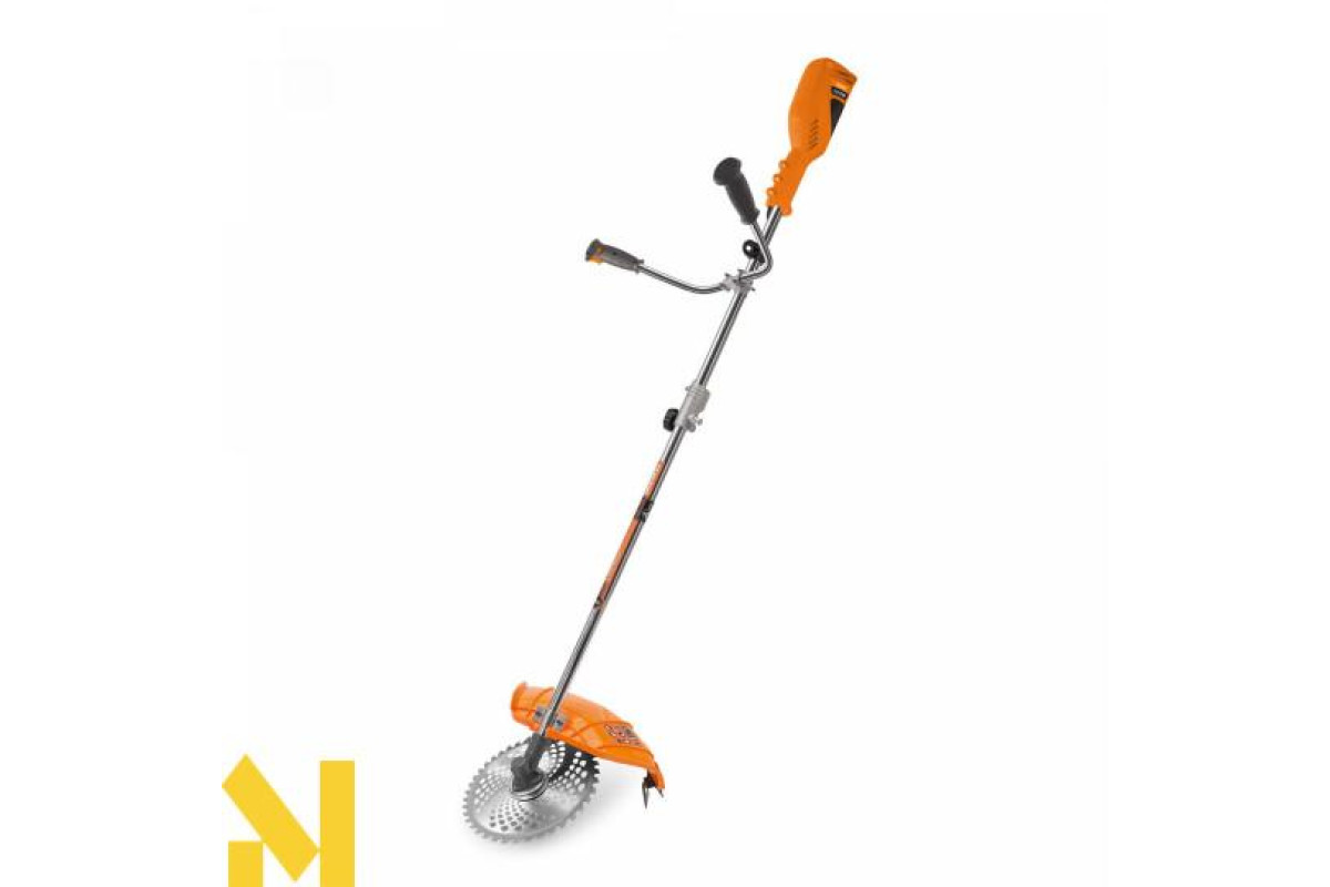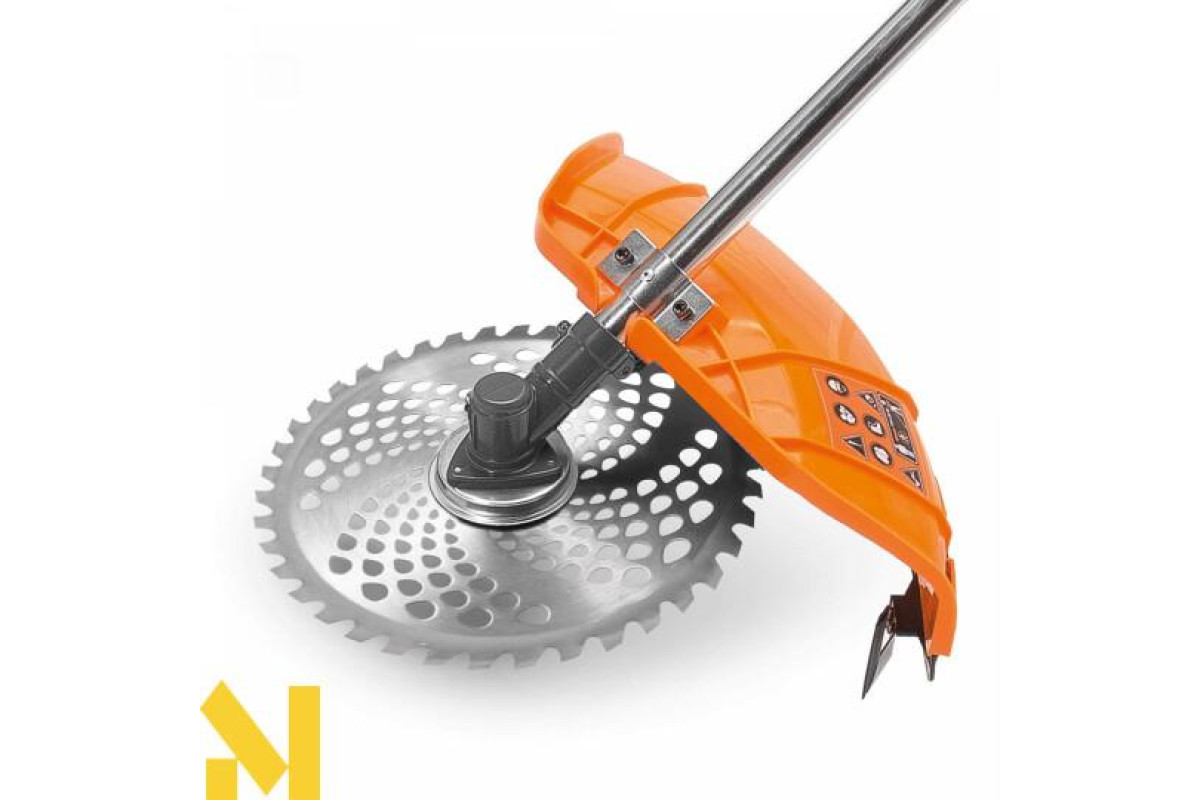 Він виготовлений з високоміцної сталі та оснащений 40 твердосплавними зубами. Підходить для скошування жорсткої трави, кущів і тонких стовбурів дерев.