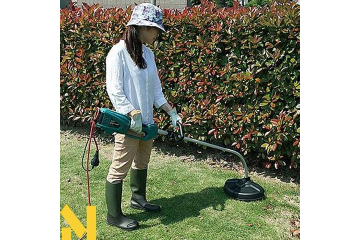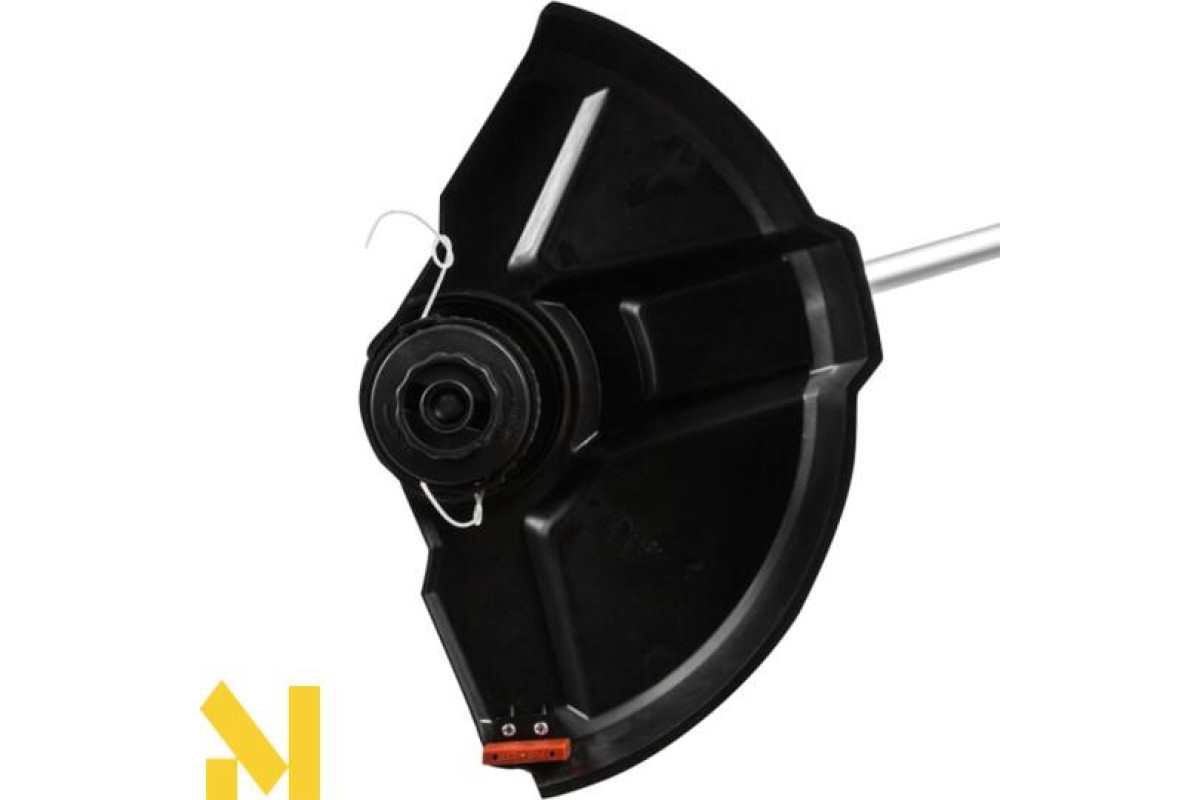 Приводом з верхнім розташуванням слугує електричний двигун потужністю 1 кВт, який не потребує спеціального технічного обслуговування. Захисний пластиковий кожух із ножем-обмежувачем ріжучого корду забезпечує ширину скошування до 35 см. Косильна шпуля електричної коси має напівавтоматичний принцип випуску волосіні. Керування інструментом просте та інтуїтивно зрозуміле, в конструкції зігнутої під прямим кутом штанги передбачена D-подібна ручка з прогумованою накладкою для комфортного використання.