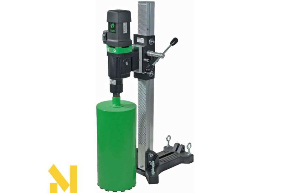 Установка алмазного буріння Eibenstock DBE 250 R використовується для мокрого свердління отворів у залізобетоні, натуральному камені та асфальті. Максимальний діаметр свердління складає 250 мм. Потужність установки алмазного свердління – 2,5 кВт. Механічний редуктор у масляній ванні та вугільні щітки підвищують зносостійкість двигуна. Тип кріплення – анкерне. Доступне свердління під нахилом 45 °.