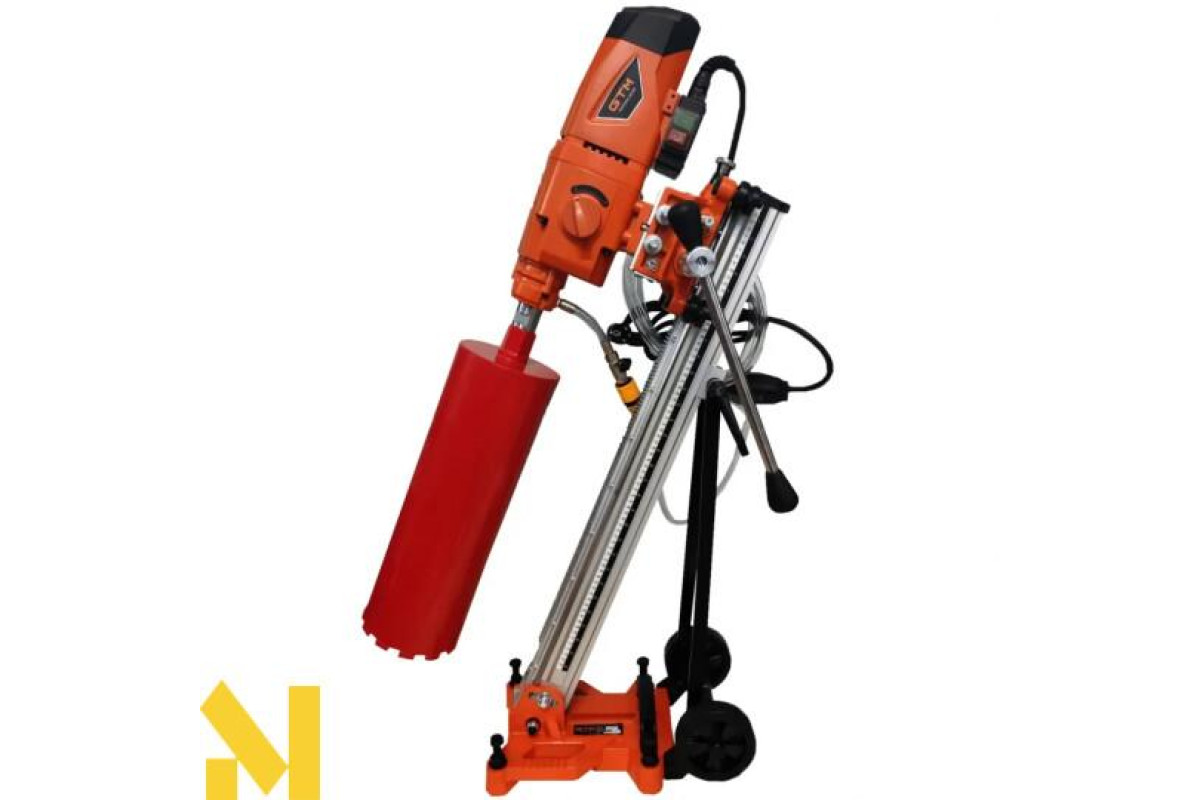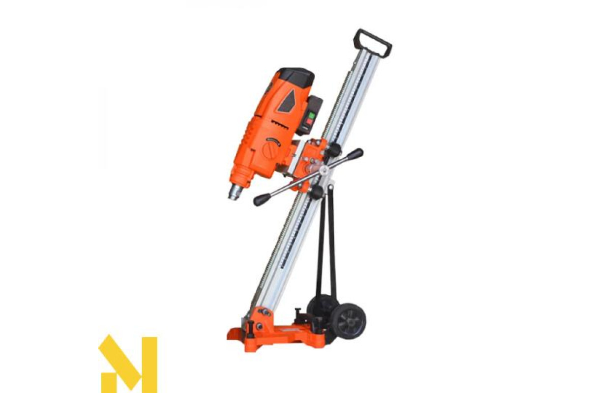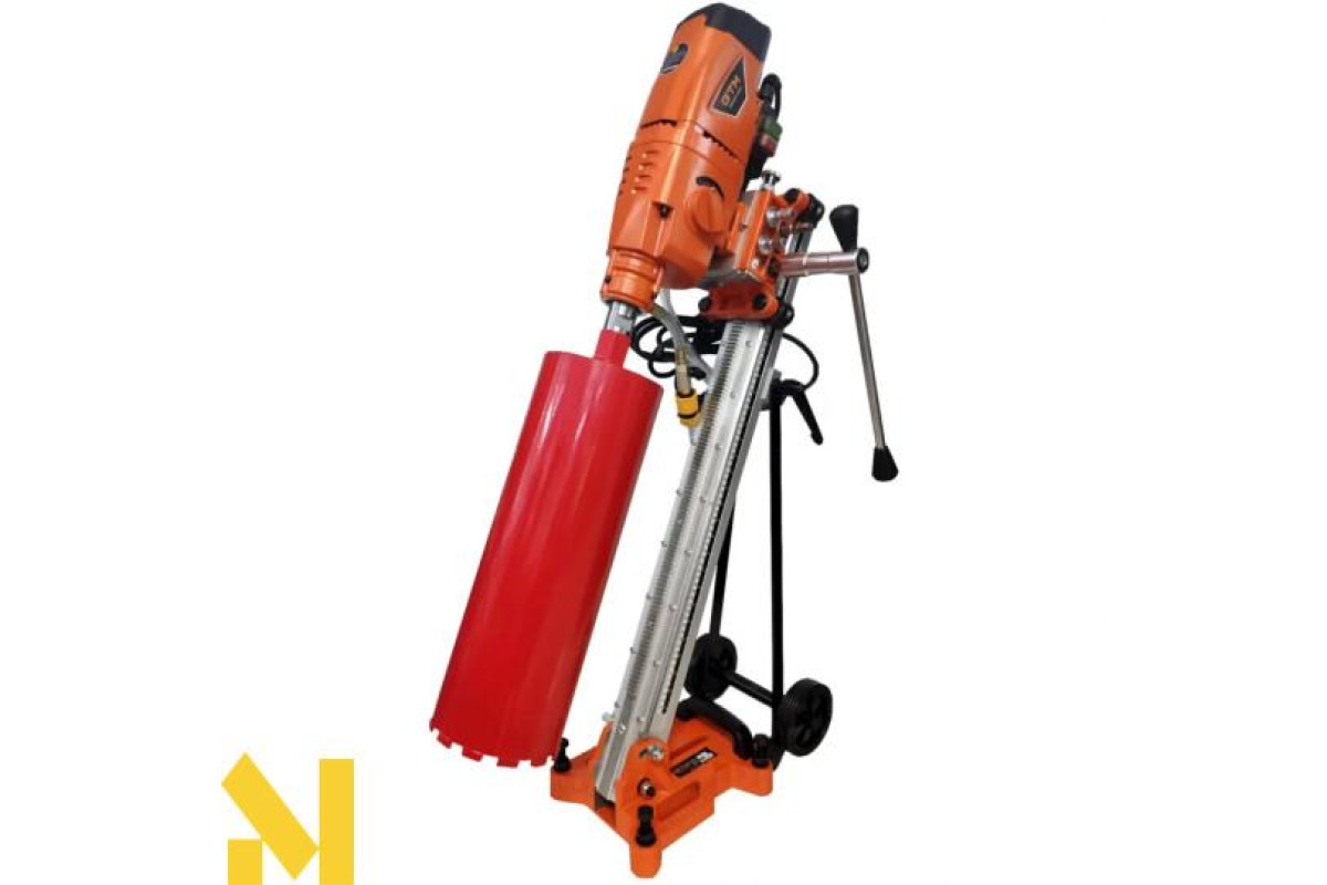 Бурильна установка включає в себе електродвигун, редуктор, пульт керування. На корпусі редуктора моделей DK-250 та SCY-26/3EBM є ручка перемикання передач, для підбору оптимальних обертів шпинделя та крутного моменту під діаметр свердла. Шпиндель має різьбу для кріплення алмазної коронки. Силова установка для використання зі стійкою кріпиться до каретки. За допомогою важеля на каретці виконується переміщення алмазної коронки на потрібну глибину свердління. Основа стійки, повинна бути надійно зафіксована на поверхні за допомогою анкерного болта, який іде в комплекті. Двигун кріпиться на сталевій станині та пересувається за допомогою каретки. До роз'єму системи охолодження швидкознімним затискачем підключається пристрій подачі води або спеціальної емульсії, що значно збільшує термін експлуатації витратного інструменту.