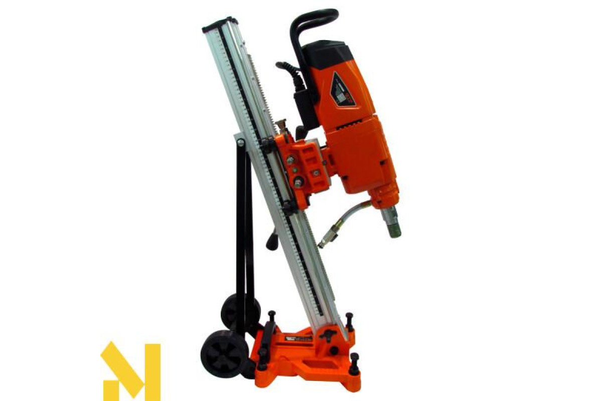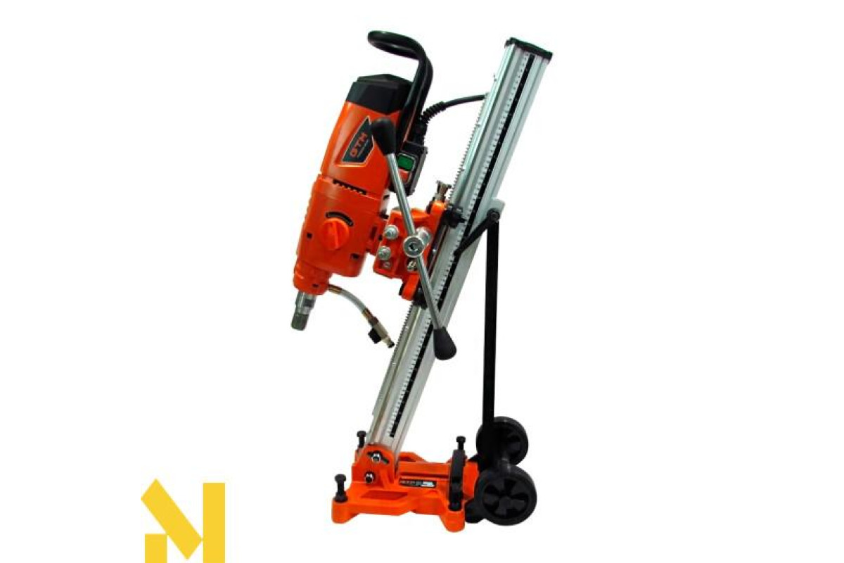 Бурильна установка включає в себе електродвигун, редуктор, пульт керування. На корпусі редуктора є ручка перемикання передач, для підбору оптимальних обертів шпинделя та крутного моменту під діаметр свердла. Шпиндель має різьбу для кріплення алмазної коронки. Силова установка для використання зі стійкою кріпиться до каретки. За допомогою важеля на каретці виконується переміщення алмазної коронки на потрібну глибину свердління. Основа стійки, повинна бути надійно зафіксована на поверхні за допомогою анкерного болта, який іде в комплекті. Двигун кріпиться на сталевій станині та пересуваєтьсяза допомогою каретки, стійка може змінювати кут нахилу до 45°. До роз'єму системи охолодження швидкознімним затискачем підключається пристрій подачі води або спеціальної емульсії, що значно збільшує термін експлуатації витратного інструменту.