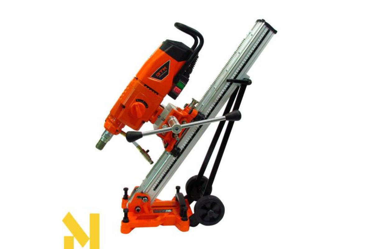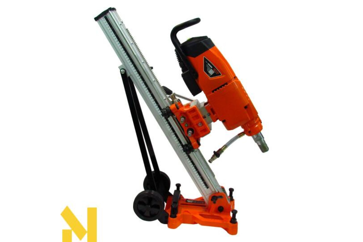 Бурильна установка включає в себе електродвигун, редуктор, пульт керування. На корпусі редуктора є ручка перемикання передач, для підбору оптимальних обертів шпинделя та крутного моменту під діаметр свердла. Шпиндель має різьбу для кріплення алмазної коронки. Силова установка для використання зі стійкою кріпиться до каретки. За допомогою важеля на каретці виконується переміщення алмазної коронки на потрібну глибину свердління. Основа стійки, повинна бути надійно зафіксована на поверхні за допомогою анкерного болта, який іде в комплекті. Двигун кріпиться на сталевій станині та пересуваєтьсяза допомогою каретки, стійка може змінювати кут нахилу до 45°. До роз'єму системи охолодження швидкознімним затискачем підключається пристрій подачі води або спеціальної емульсії, що значно збільшує термін експлуатації витратного інструменту.