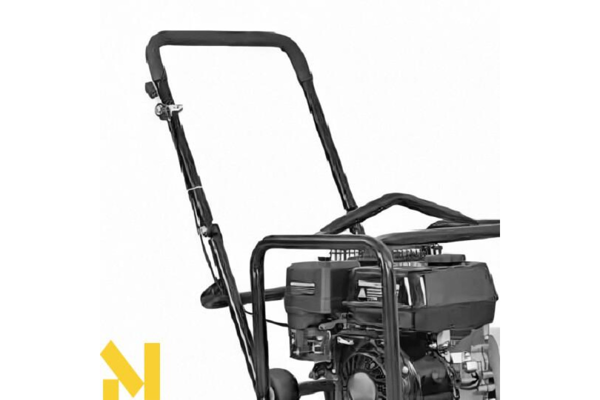 З’ємна ручка і вузол для підйому у вигляді рами над двигуном дає змогу без проблем транспортувати пристрій. Також для зручності транспортування ця вібраційна плита обладнана транспортувальними колесами.