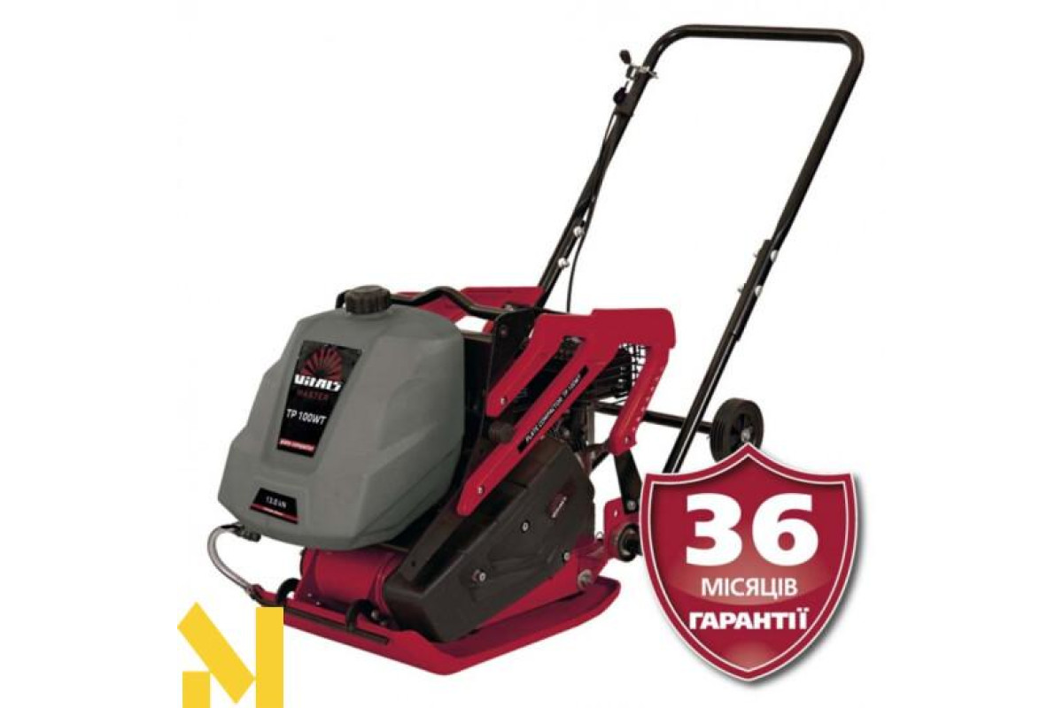 Вібраційна плита Vitals Master TP 100WT є дорожньо-будівельним устаткування вібраційного типу, призначене для ущільнення сипучих порід грунту (пісок, щебінь, гравій), сумішей (сухі види стяжок), асфальту і асфальтобетону, укладання тротуарної плитки та бруківки. Завдяки компактному розміру і маневреності пристрій працює в недоступних для важкої дорожньої техніки місцях, закритих приміщеннях і на невеликих площах. Працює виріб від одноциліндрового 4-тактного двигуна з повітряним охолодженням об'ємом 196 см³ і загальною потужністю 6,5 к.с., що робить вібраційну плиту Vitals Master TP 100WT мобільною і абсолютно не прив'язаною до джерела живлення 220 В. Важіль дроселя виведений на рукоятку оператора. Вібраційне зусилля, або відцентрова сила віброплити 13 кН і частота вібрації 5500 циклів/хв. дозволяє домагатися відмінних результатів і ущільнювати підставу товщиною до 30 мм. При вазі в 96 кг і закругленою плиті розміром 545x400 мм, виготовленої з високоміцного металу з підвищеною зносостійкістю, вібраційна Vitals Master TP 100WT докладає зусилля 23 г/мм.