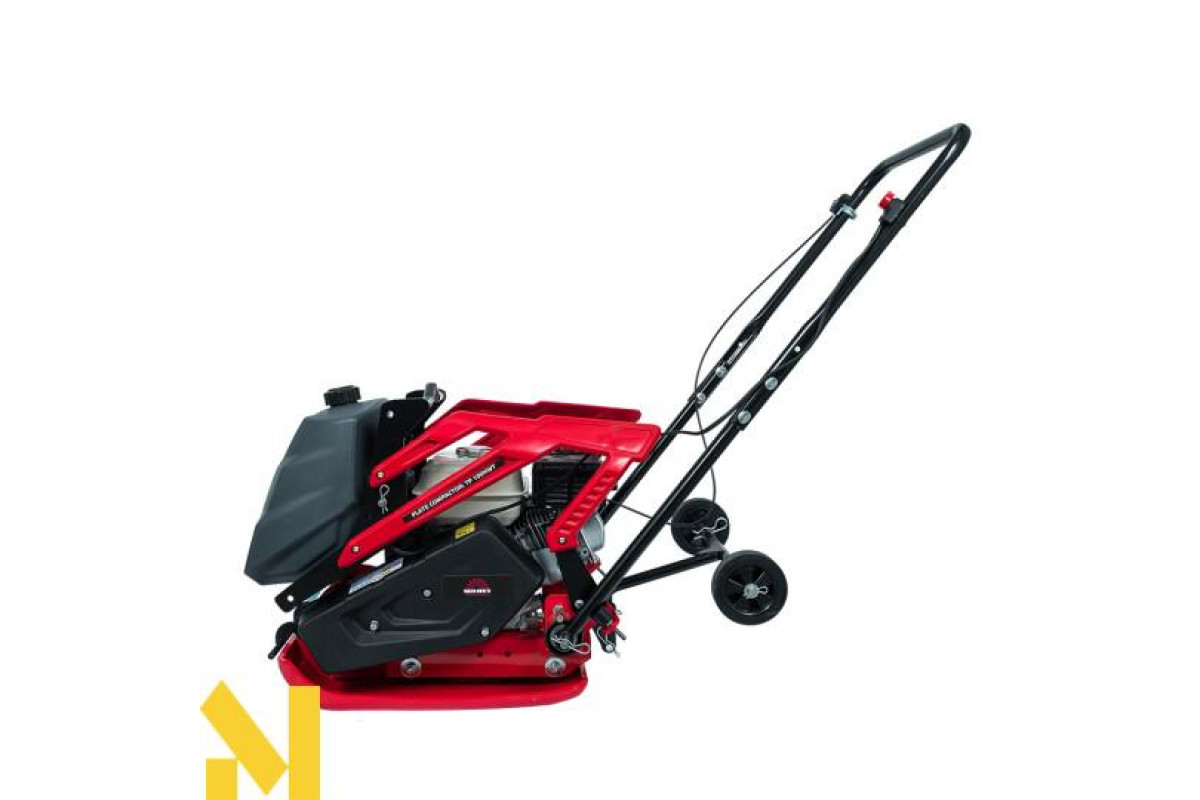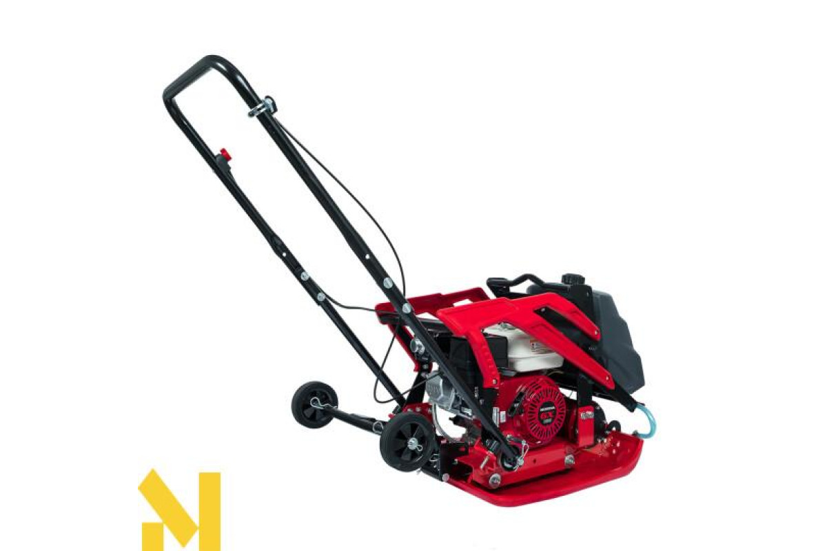 Складається ручка і вузол для підйому у вигляді рами над двигуном дозволяє без проблем транспортувати. Також для зручності транспортування дана вібраційна плита обладнана транспортувальні колесами. У комплект входить свічковий ключ і поліуретановий килимок.