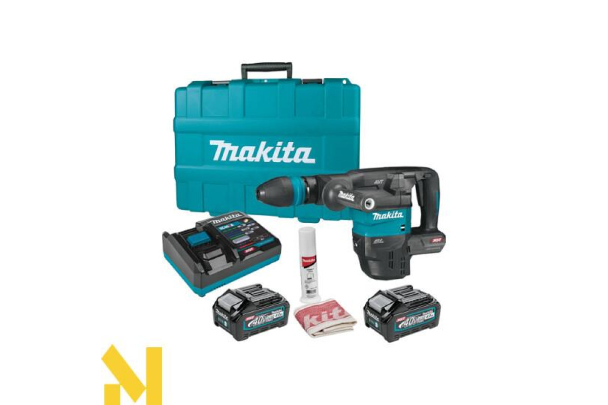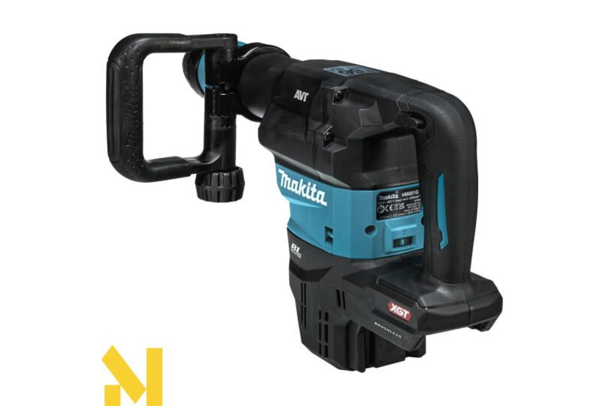 Новий акумуляторний відбійний молоток HM001G для важких робіт, з патроном SDS-MAX, що живиться від акумулятора XGT® 40V max, з параметрами, аналогічними мережевій моделі HM0871C. Компактний та потужний перфоратор. Він має систему AWS, яка дозволяє бездротове з'єднання пилососа та електроінструменту за допомогою модуля Bluetooth, завдяки якому пилосос запускається автоматично при запуску інструменту. Два вбудовані світлодіоди освітлюють робочу зону з функцією затримки гасіння. Він має 12-позиційне регулювання зубила (кожні 30°) та 5-ступінчасте регулювання максимальної частоти ударів за допомогою ручки регулювання та плавного регулювання курка-перемикача на кожному з них. Використання одного акумулятора XGT® 40 V max замість двох акумуляторів LXT® 18 V мінімізує збільшення ваги та габаритів інструменту, забезпечуючи таку ж або більшу потужність та маневреність, ніж у дротових моделей.