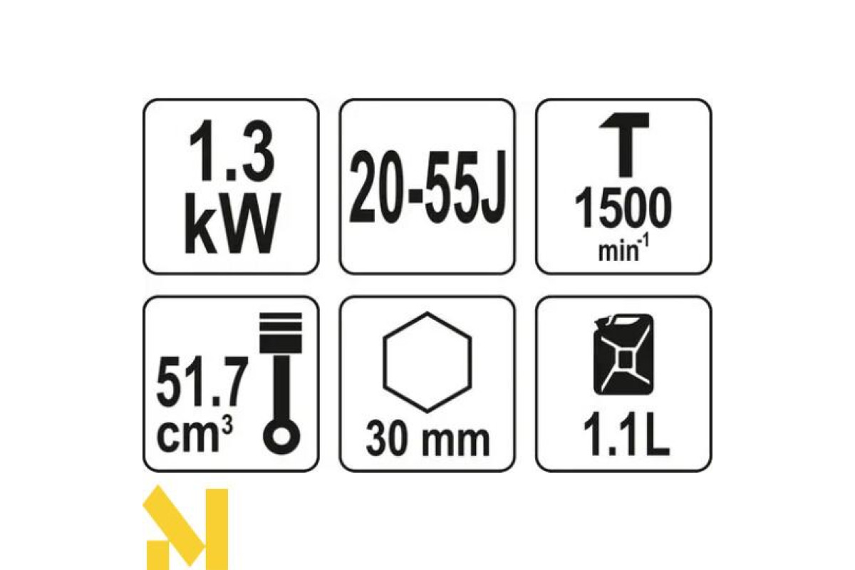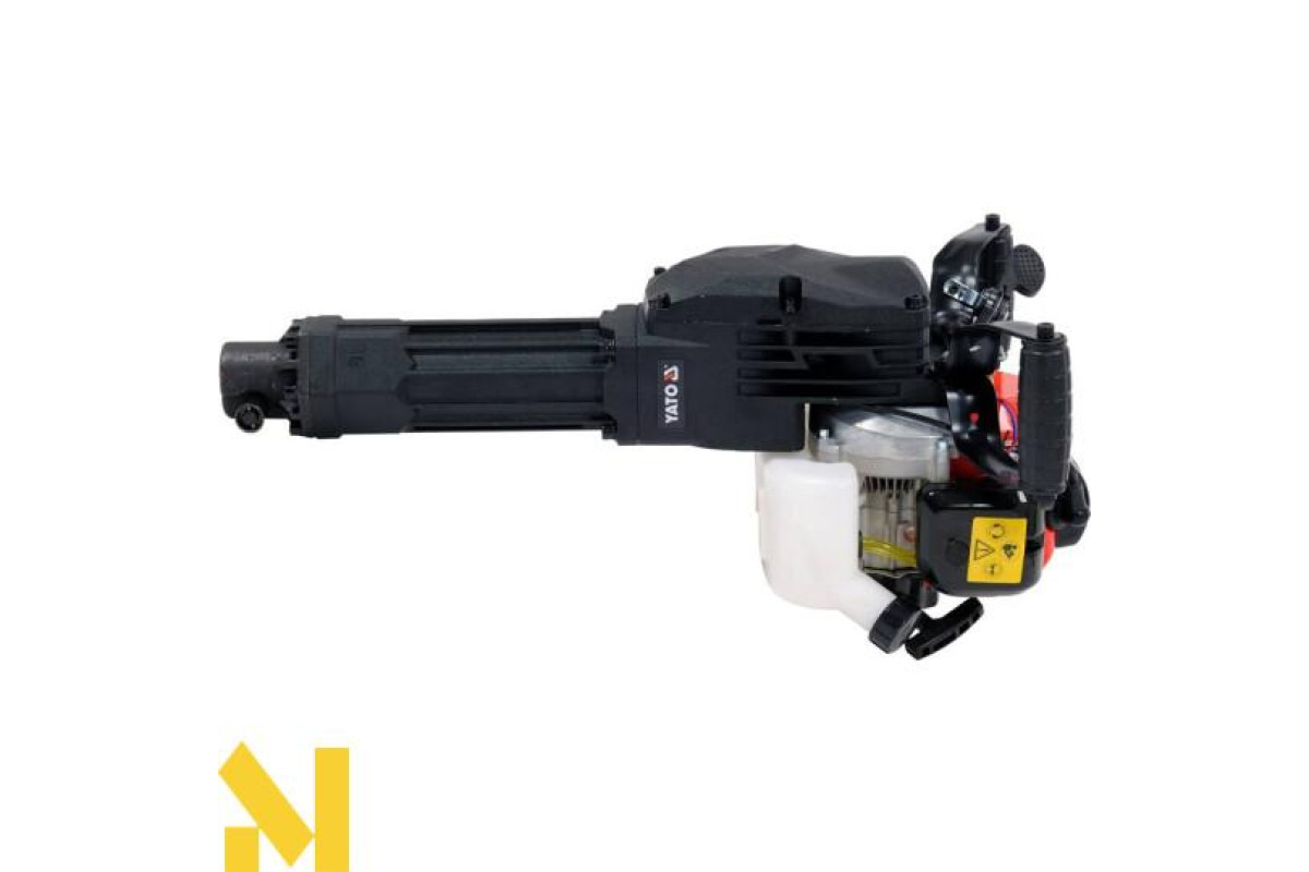 Відбійний молоток із двотактним двигуном внутрішнього згоряння. Важить конструкція 11 кг, тому експлуатація пристрою є зручною. Сила удару 55 Дж ефективно руйнує залізобетон, що використовується в фундаментах, та природний камінь. Низька витрата палива (0,9 л/міс) робить пристрій дуже економічним. На відміну від електромолотів, немає необхідності використовувати важкі електрогенератори, вага яких не менше 40 кг, що вимагає роботи в бригаді з двох осіб. Молот YT-82007 керується однією людиною без особливих зусиль. Крім функції довбання, цей тип молота може працювати як перемичка для ущільнення ґрунту (підходить для шестигранної лапи 30 мм YT-47385).