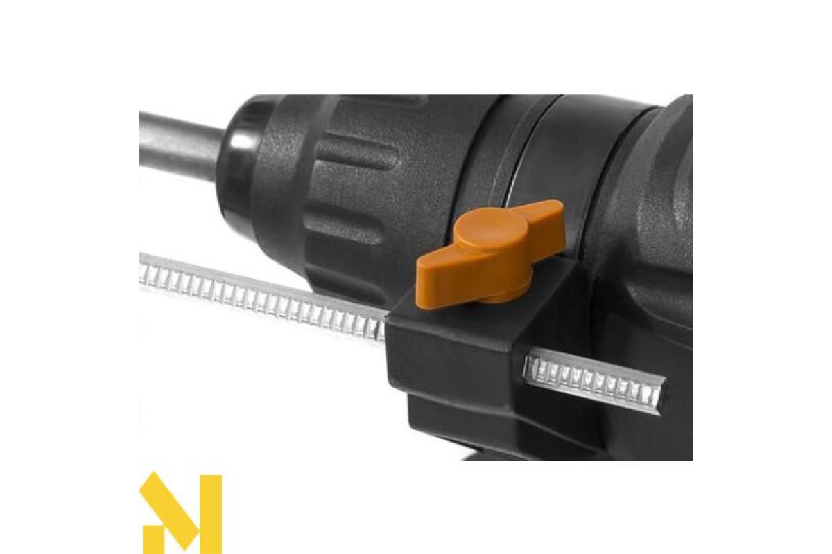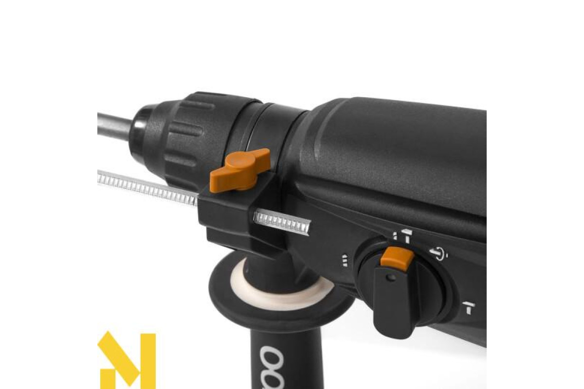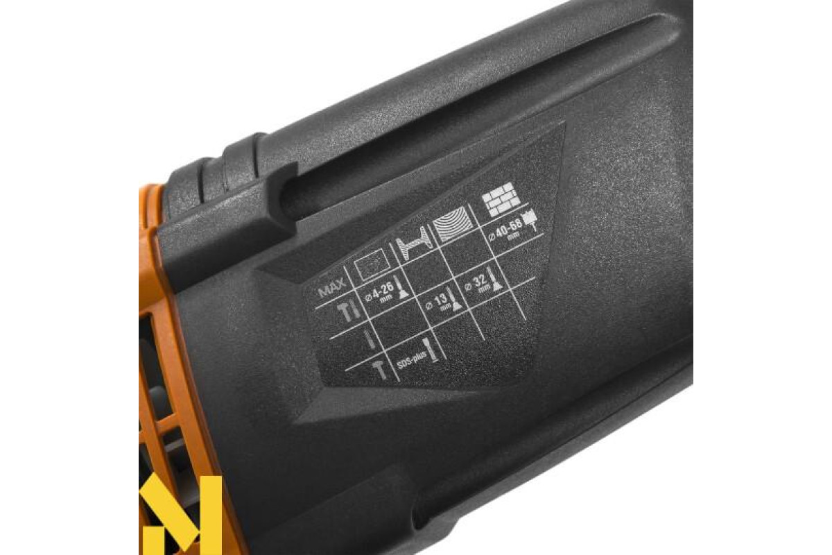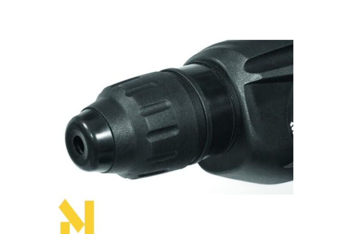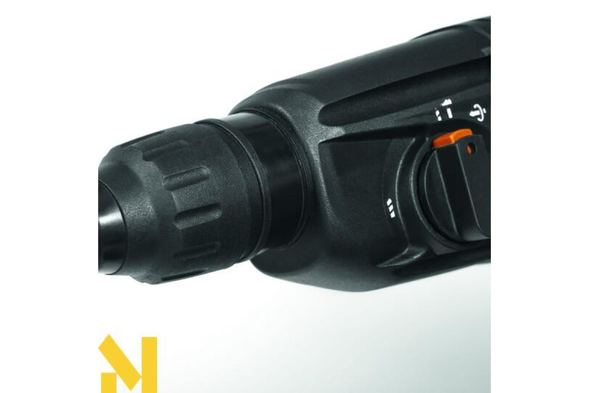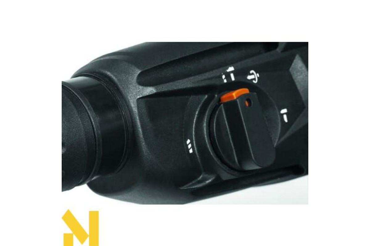 Ударний молоток для роботи з каменем, бетоном, цеглою та деревом. Інструмент має 4 режими роботи: свердління, свердління з ударом, довбання з фіксатором долота, довбання без фіксатора долота. У комплект молотка входить 3 свердла, зубило, кирка, кейс для зберігання інструменту та приладдя.