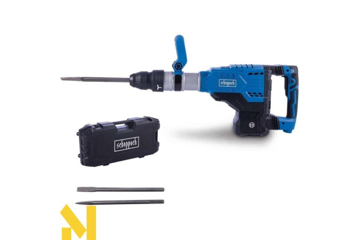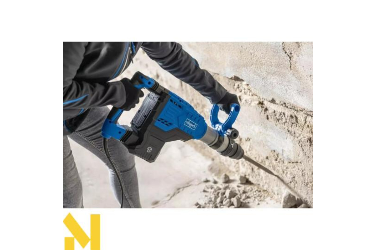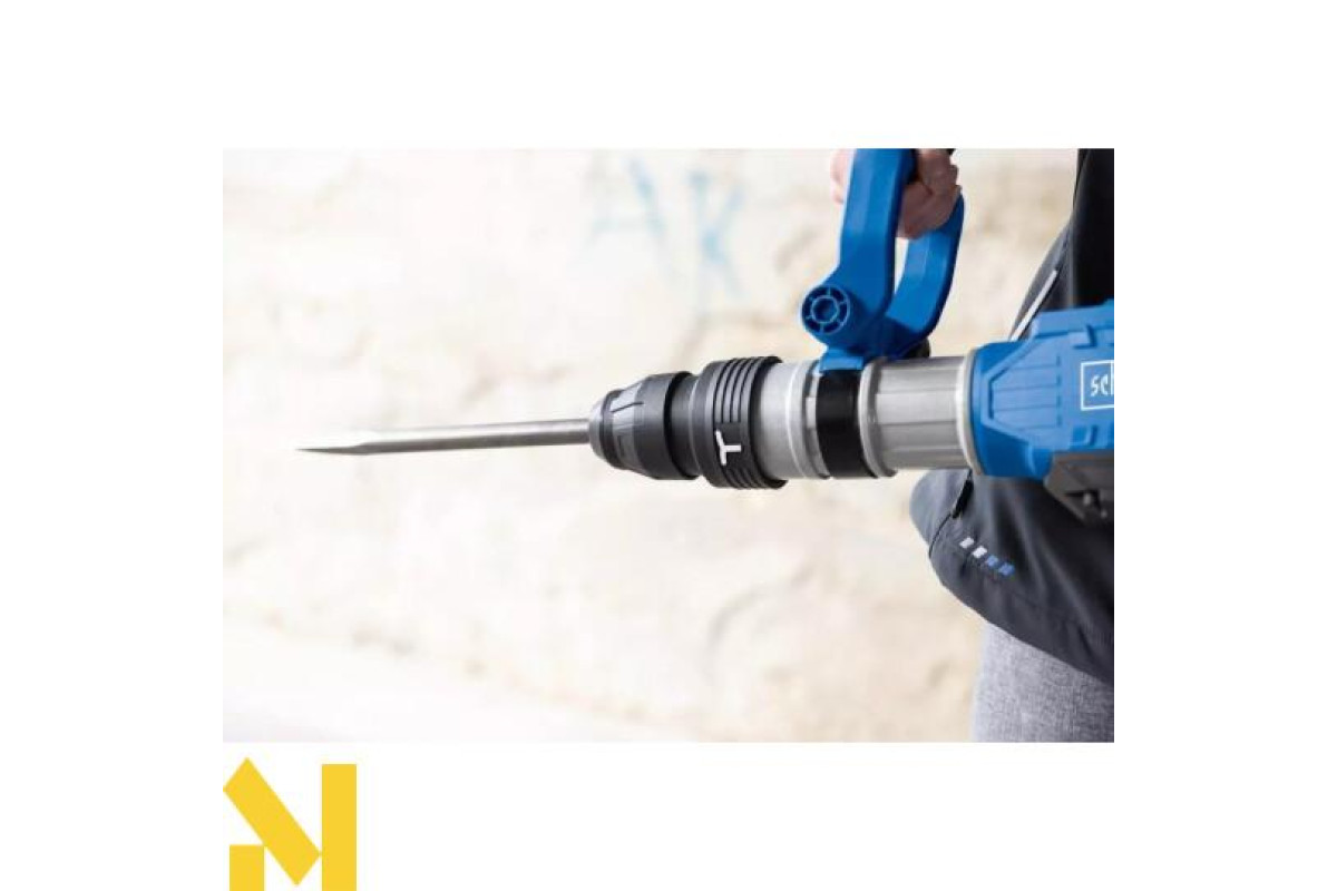 Відбійний молоток Scheppach AB2000 з ударною силою 60 джоулів, частотою ударів 2000 уд/хв та потужним двигуном 1700 Вт ідеально підходить для складних демонтажних робіт або проривів у бетоні, камені чи цегляній кладці. Патрон SDS-Max дозволяє легко змінювати насадки без інструментів. Зубило можна зафіксувати в 12 різних положеннях, що дозволяє оптимально налаштувати його для відповідного застосування.