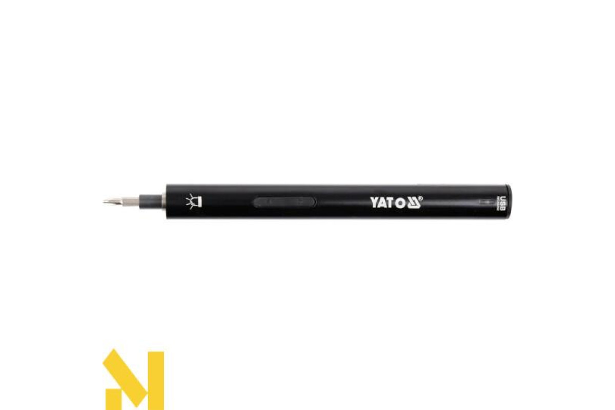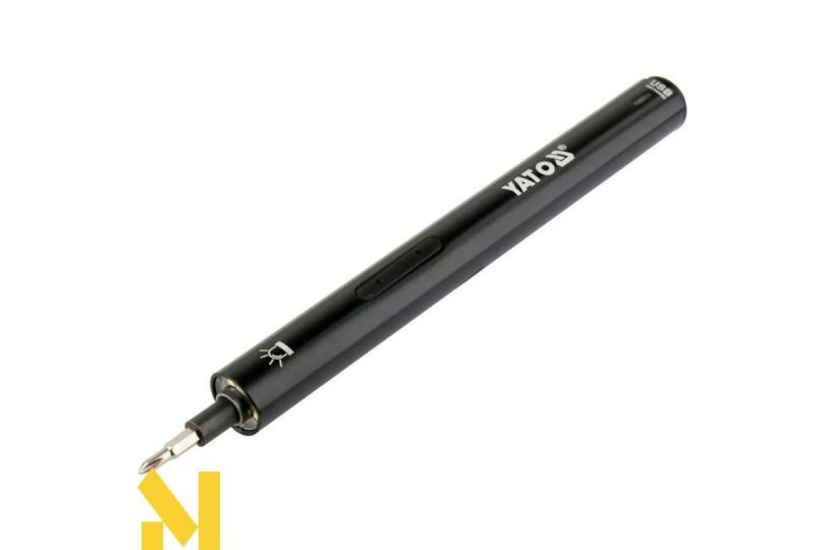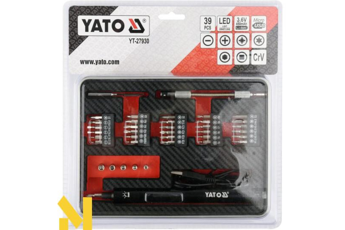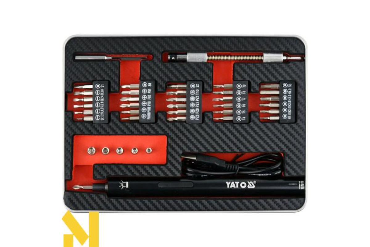 Компактна акумуляторна викрутка YATO YT-27930 з набором біт і подовжувачів, призначена для точних робіт, в тому числі ремонту електронного устаткування.