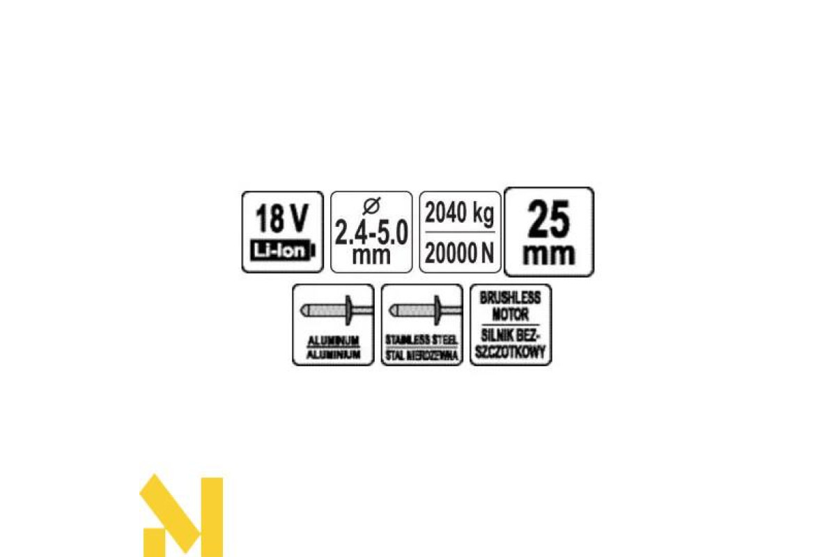 Заклепочник живиться від акумуляторів системи Yato 18 (продаються окремо), які є загальною платформою для широкого спектру пристроїв, таких як ударні гайковерти, перфоратори sds+, кутові шліфувальні машини і т. д.