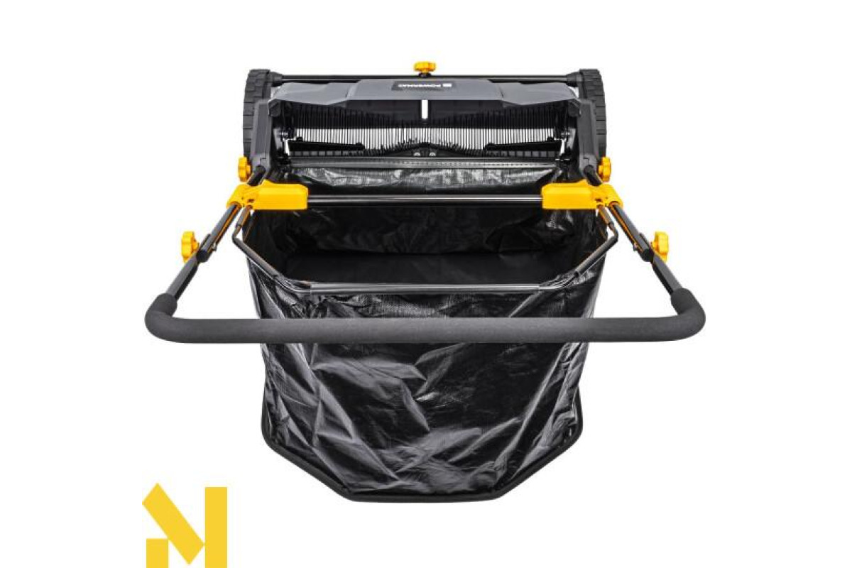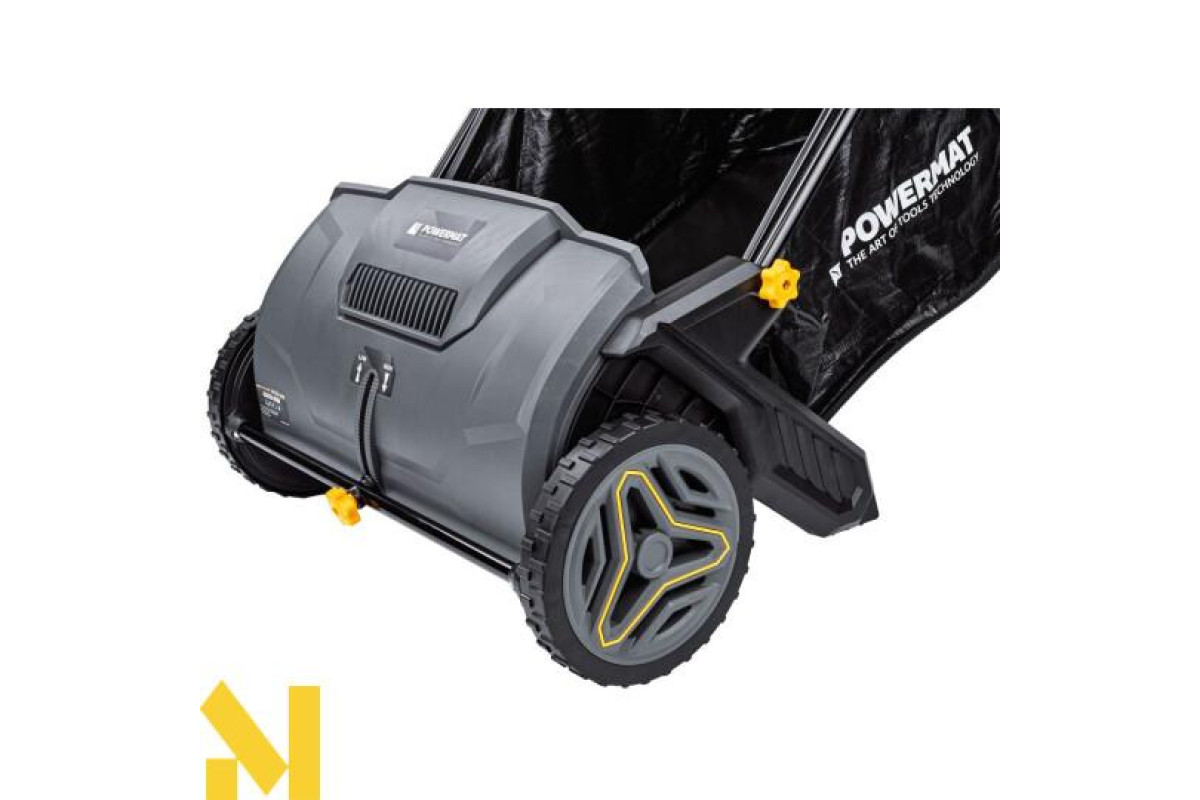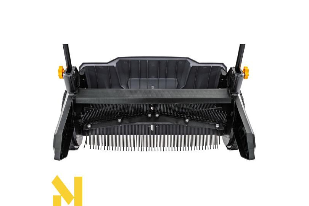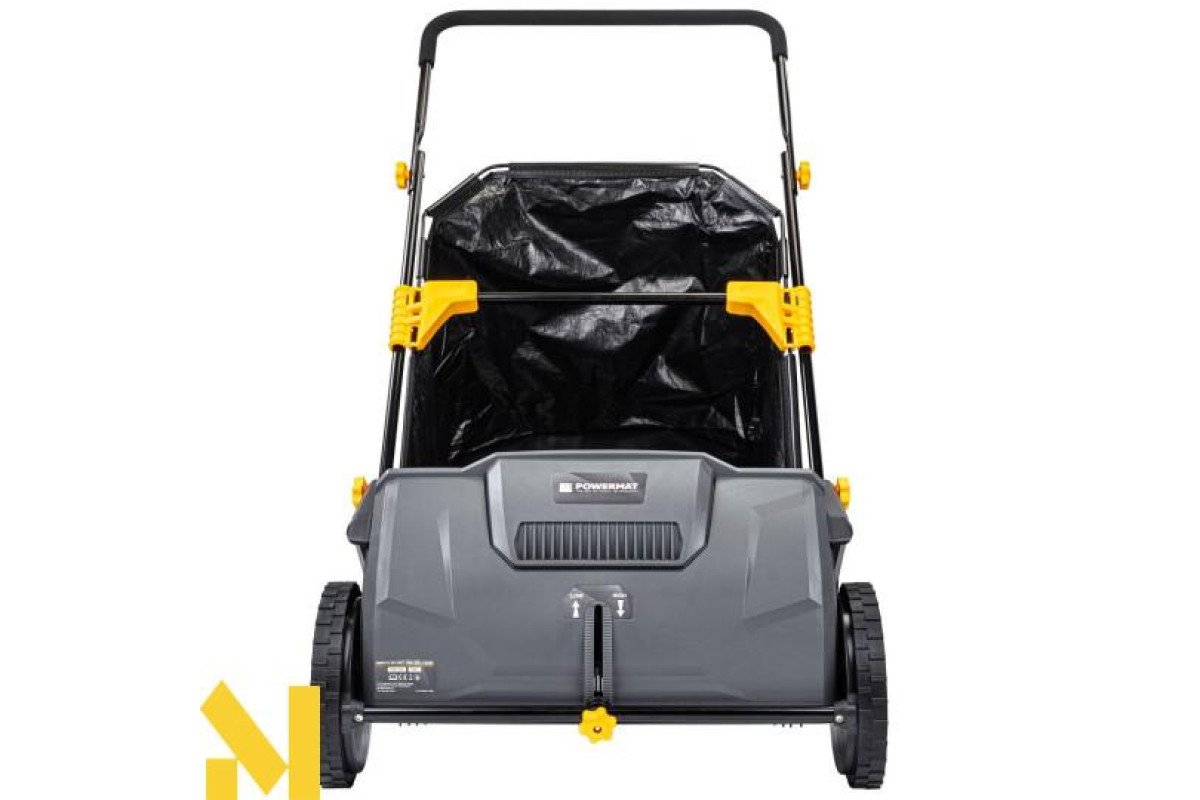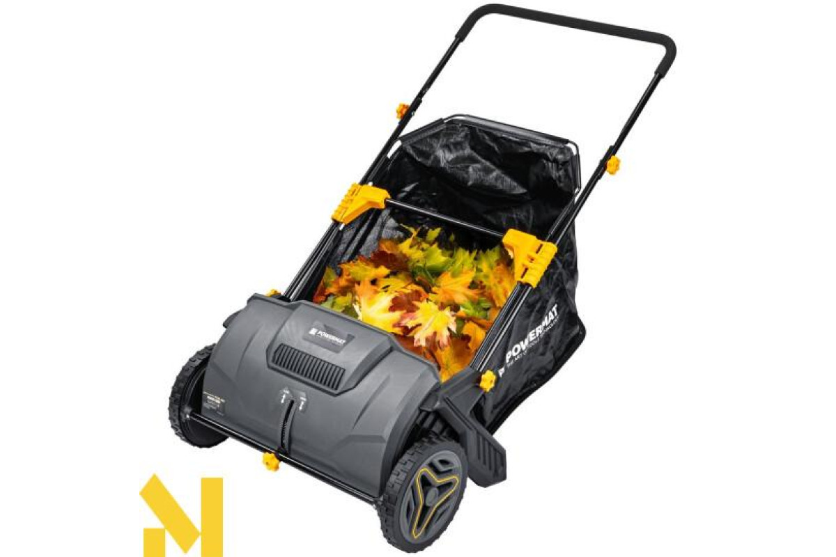 Обертові щітки, що активуються рухом коліс, збирають листя, траву та дрібні гілочки в кошик, забезпечуючи рівномірну роботу без двигуна.