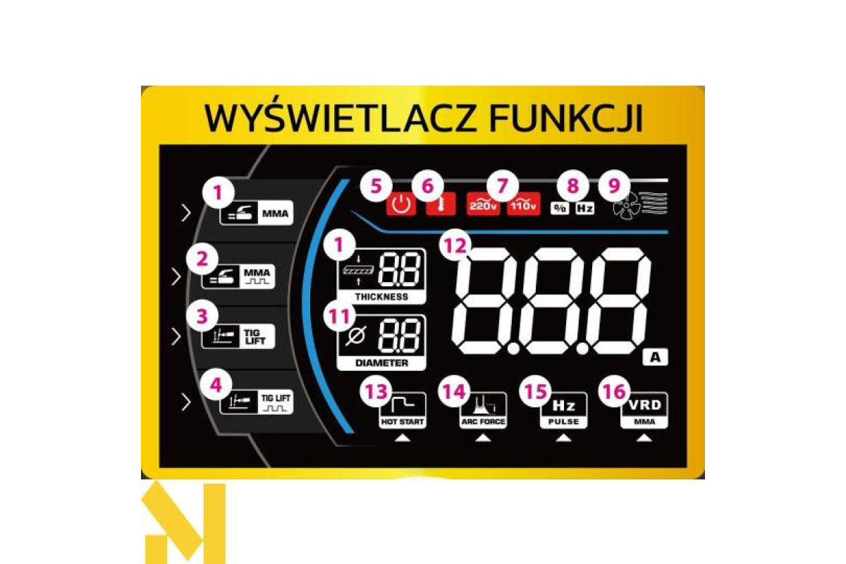 ARC FORCE стабілізує дугу, незалежно від її довжини. Зниження значень функції призводить до м'якої дуги та меншої глибини погашення, а також збільшення функції функції до більш глибокого погашення та можливості зварювання з короткою дугою. Маючи максимальне значення функції сили дуги, ви можете притиснути електрод у ванну розплавленого металу і спалити матеріал наскрізь і наскрізь. Ця модель має силу автоматичного управління дугою.
