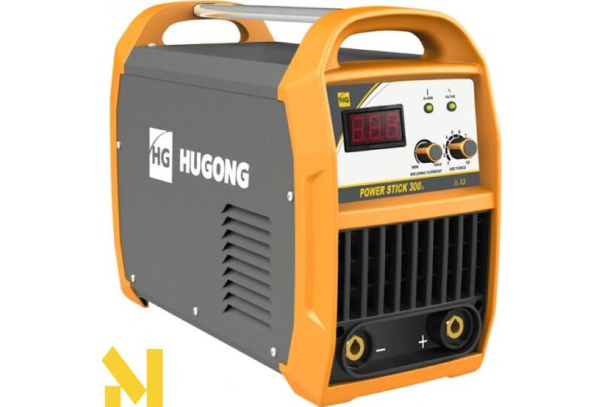 Hugong PowerStick 300 - професійний зварювальний інвертор для ручного дугового зварювання і наплавлення покритим електродом ММА на постійному струмі DC виробів із чавуну, маловуглецевої і середньовуглецевої, хромової, марганцевистої і легованої сталі, а також вугільної стружки. Апарат призначений для тривалої роботи електродами до 5 мм і може використовуватися на виробництві, при монтажі металоконструкцій на будівельних майданчиках та ін. Регульований «Форсаж дуги» підвищує стабільність зварювання на короткій дузі, покращує запалювання дуги і зменшує ймовірність залипання електрода при зварюванні.