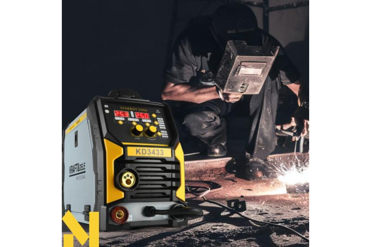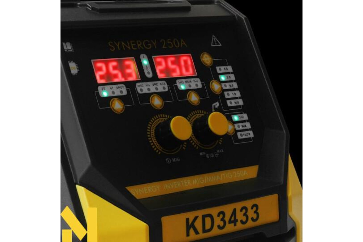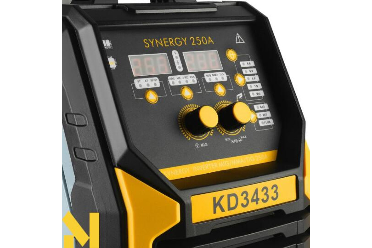 Модель KD3433 оснащена функцією SYN MIG – синергетичним вибором, який автоматично вибирає параметри зварювання, що значно спрощує роботу навіть для менш досвідчених користувачів. Опція FLUX дозволяє зварювати самозахисними дротами без використання захисних газів, а розширене меню налаштувань дозволяє точно налаштувати режим роботи відповідно до поточних потреб.