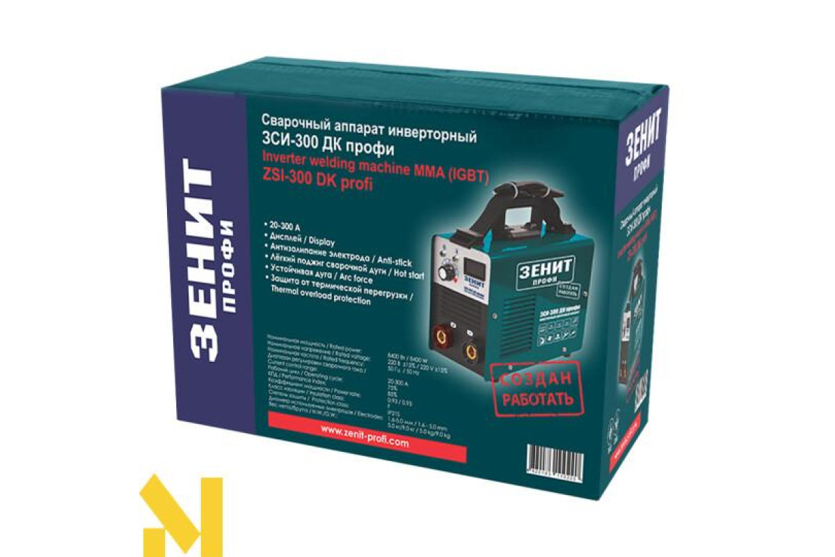 Зварювальний апарат Зеніт ЗСИ-300 ДК Профі має високу якість вузлів і деталей. Максимальний зварювальний струм 300 Ампер. Технологія IGBT. Дисплей для відображення виставлених параметрів зварювання. Система антизалипання електрода дозволяє працювати зварювальним апаратом, маючи мінімальний досвід. Збільшено клеми. Захист від термічного перевантаження. Гарячий старт. Мала вага. Компактні розміри.